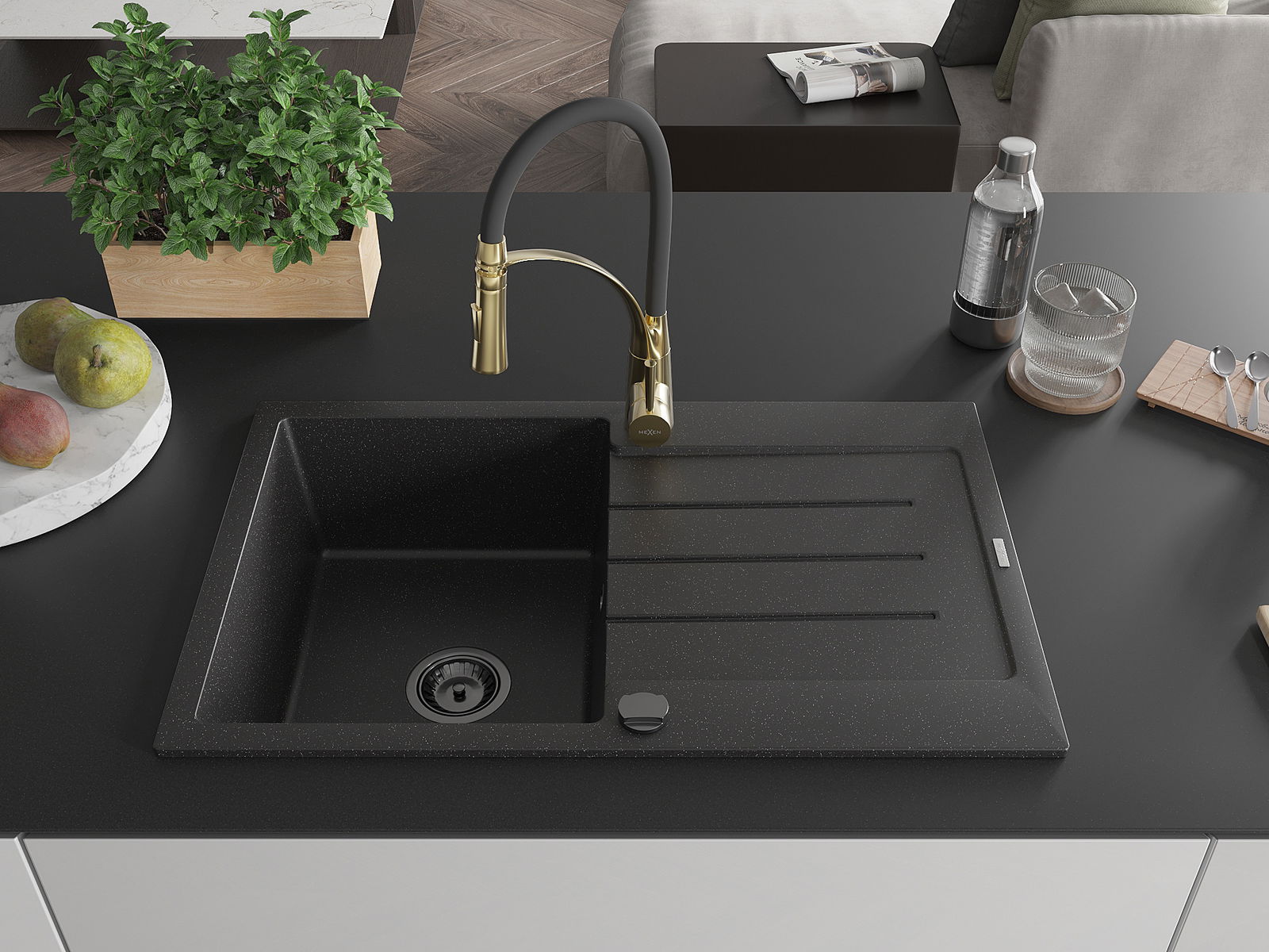 Mexen Bruno egymedencés gránit mosogató csepegtetővel és Aster konyhai csappal, fekete/ezüst metál - 6513-73-73450-57-B