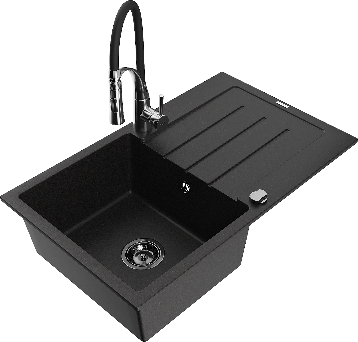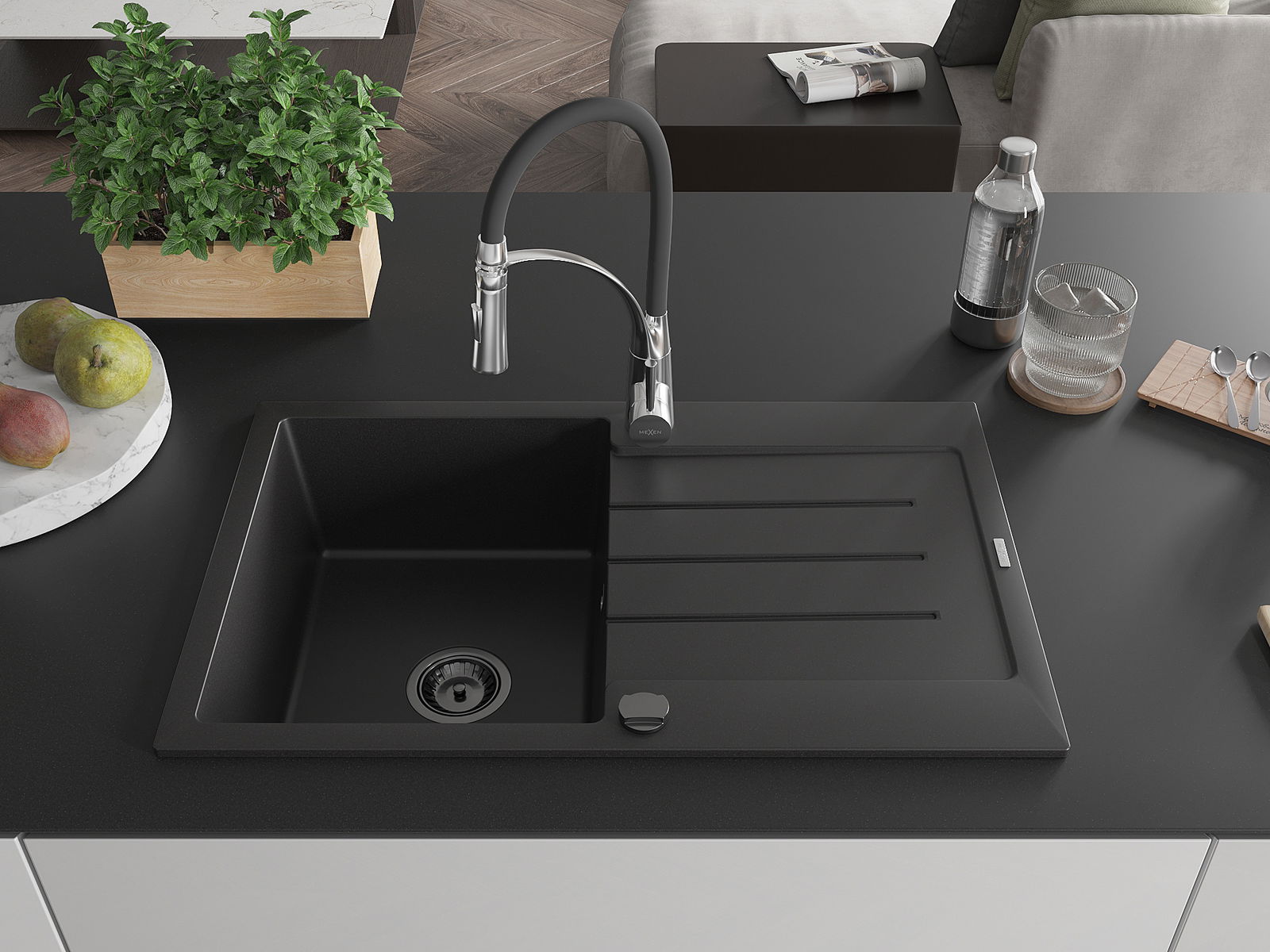 Mexen Bruno 1-medencés, csepegtetős gránit mosogató Aster konyhai csapteleppel, fekete - 6513-77-73450-07-B