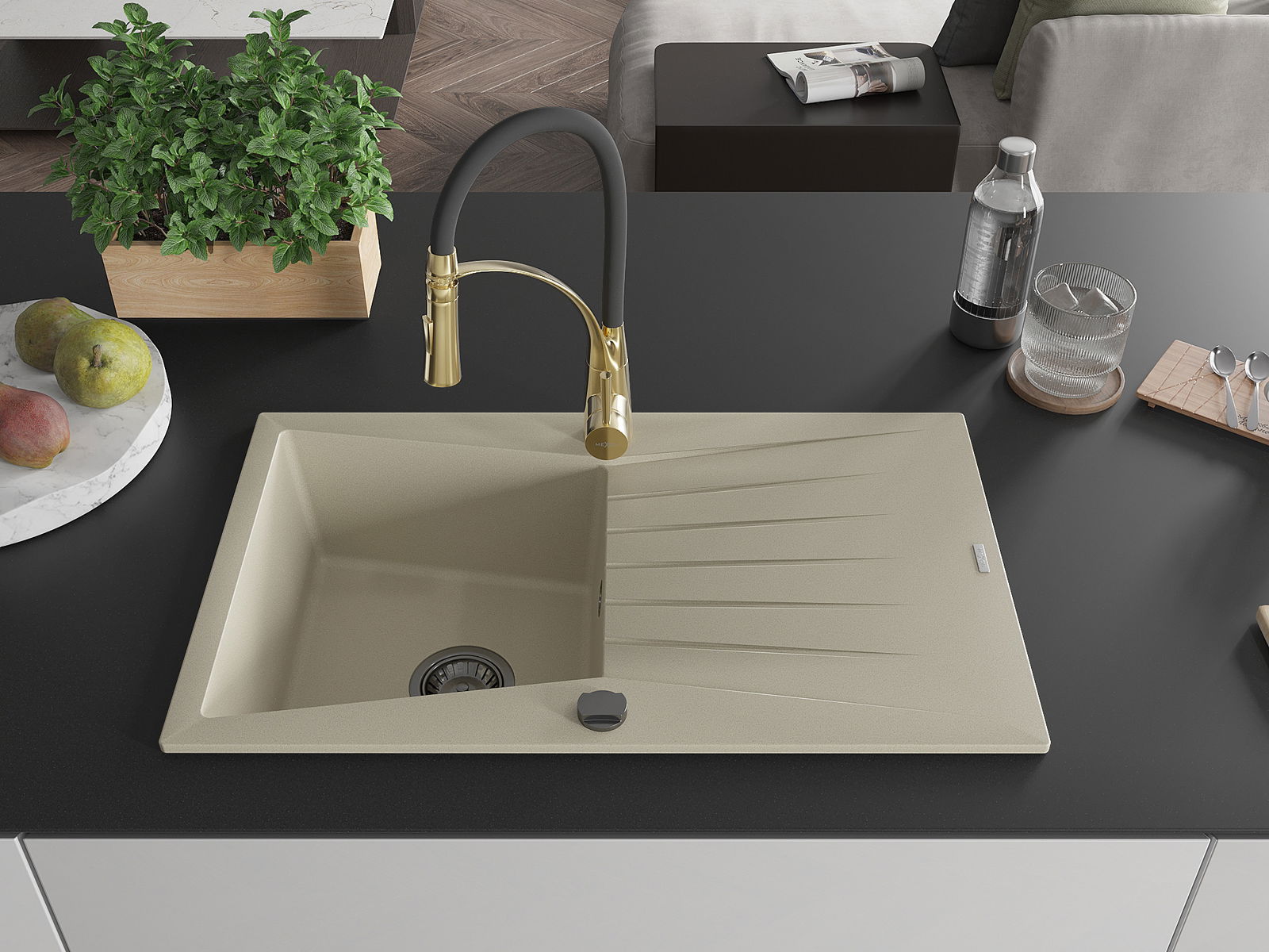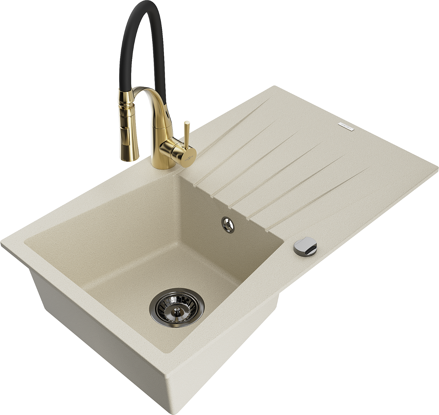 Mexen Cesar egymedencés gránit mosogató csepegtetővel és Aster konyhai csapteleppel, bézs - 6514-69-73450-57-B