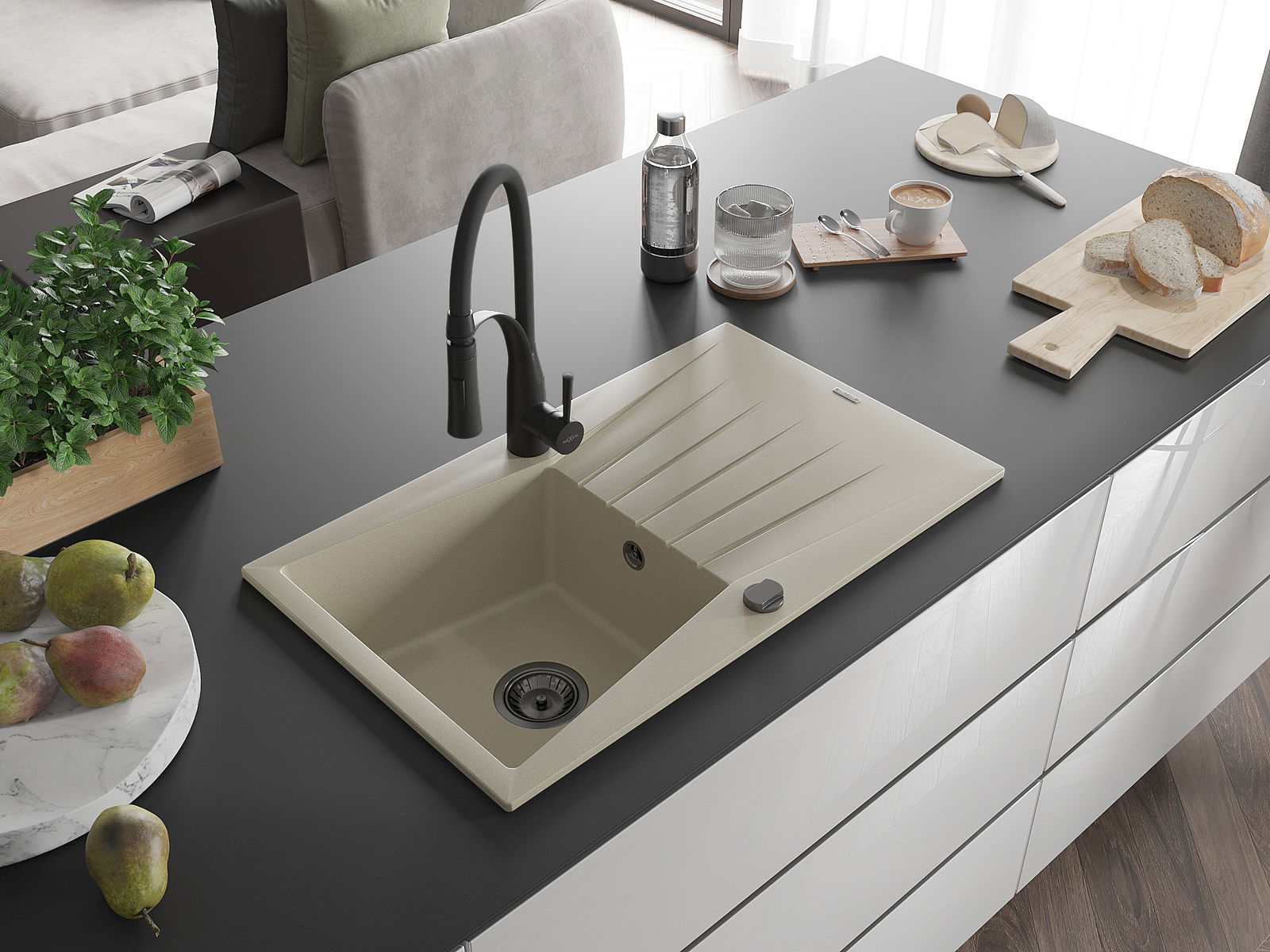 A mosogató magas minőségű gránitból készült. Elegáns, de mindenekelőtt praktikus kiegészítője minden konyhának, függetlenül annak stílusától. A gránit magas minősége és tartóssága hosszú távú használatot biztosít.