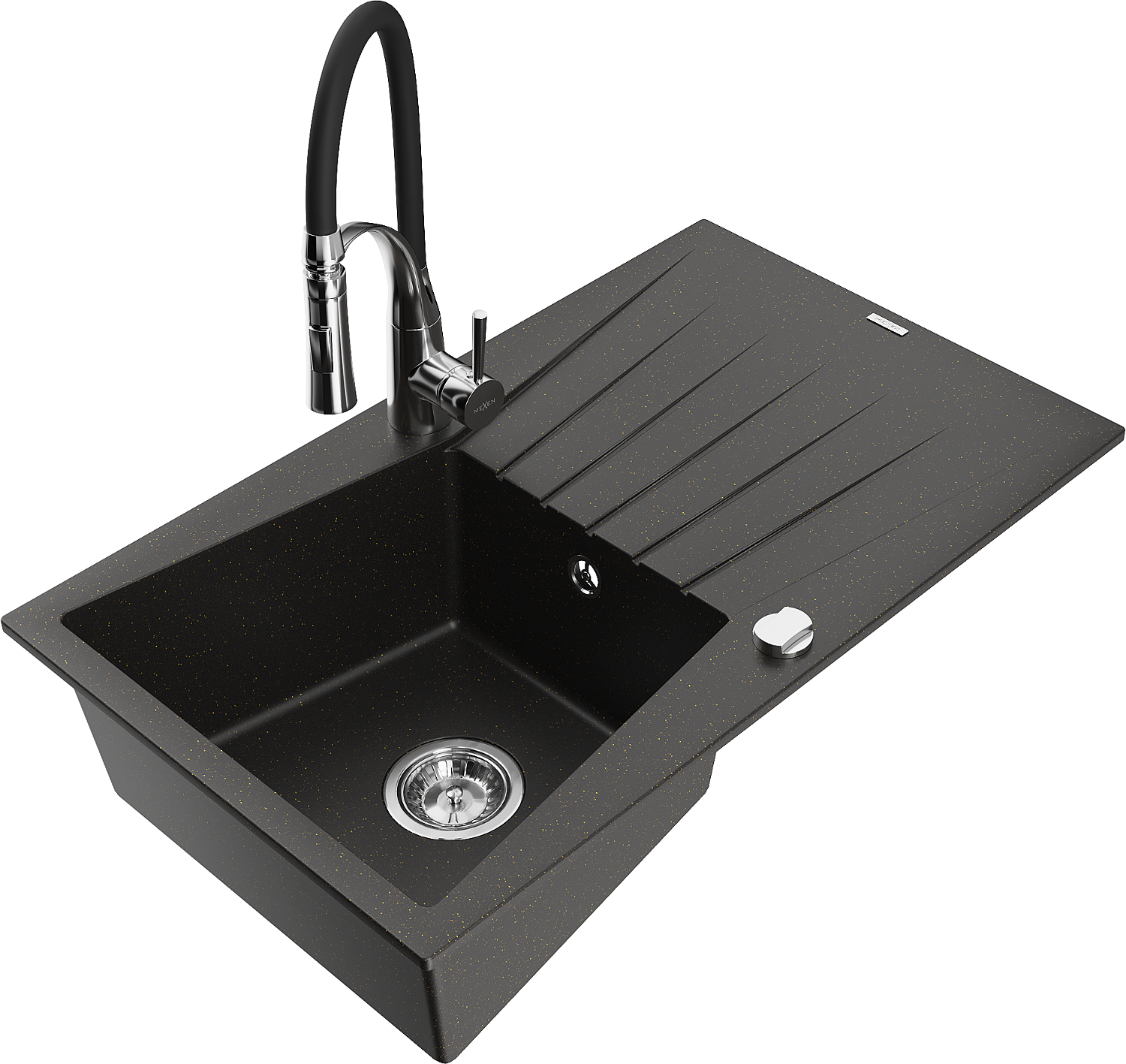 Mexen Cesar 1-medencés gránit mosogató csepegtetővel és Aster konyhai csappal, fekete/arany metál - 6514-75-73450-07