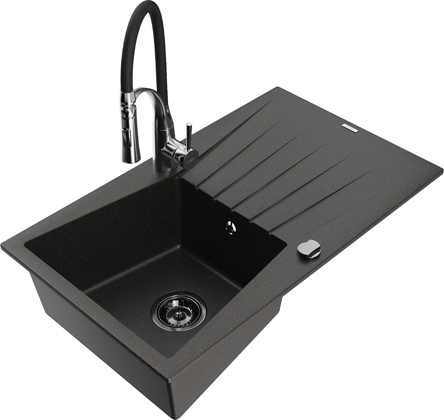 Mexen Cesar egymedencés gránit mosogató lefolyóval és Aster konyhai csapteleppel, fekete/arany metál - 6514-75-73450-07-B
