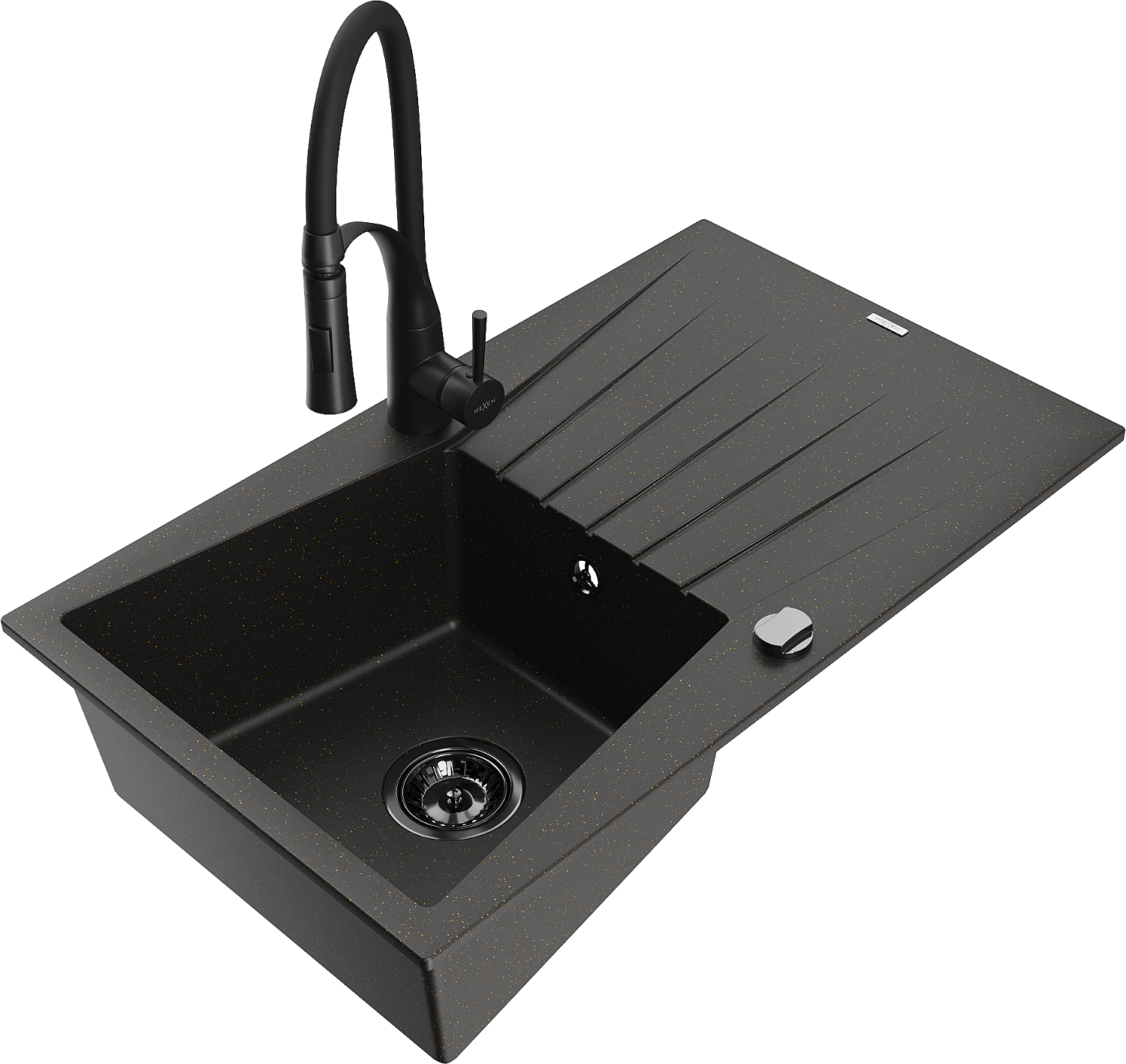 Mexen Cesar 1-medencés gránit mosogató csepegtetővel és Aster konyhai csapteleppel, fekete/arany metál - 6514-75-73450-70-B