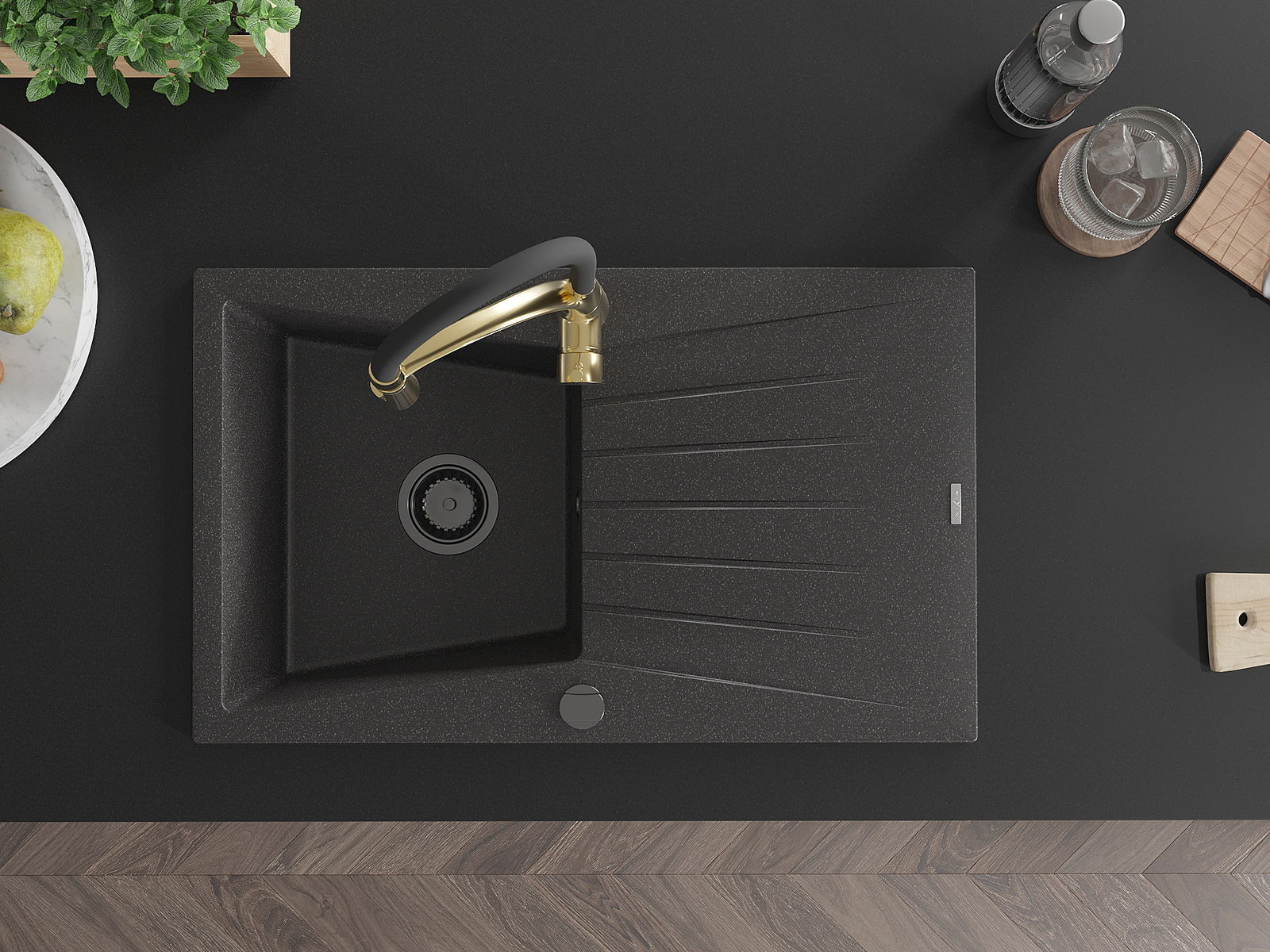 Mexen Cesar gránit mosogató 1-medencés, csepegtetővel és Aster konyhai csapteleppel, fekete pettyes - 6514-76-73450-57-B