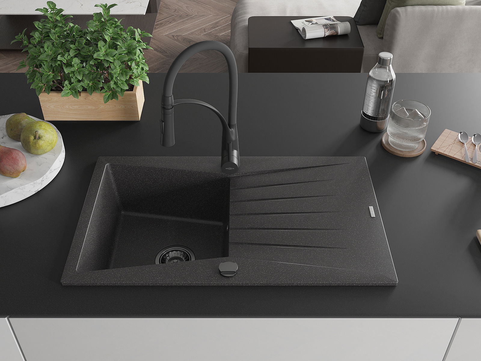 Mexen Cesar gránit mosogató 1-medencés csepegtetővel és Aster konyhai csapteleppel, fekete pöttyös - 6514-76-73450-70-B