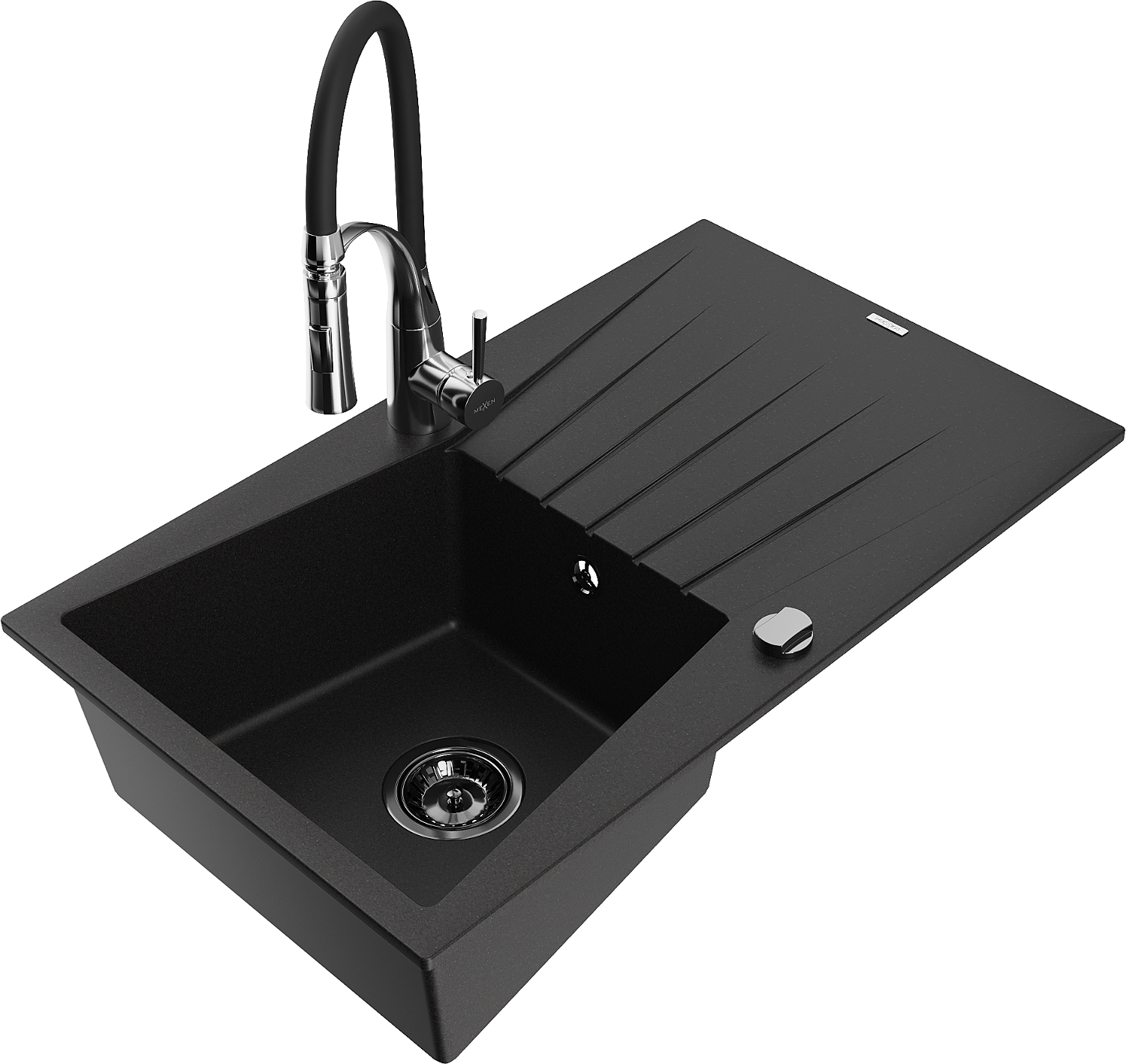 Mexen Cesar 1 rekeszes gránit mosogató csepegtetővel és Aster konyhai csapteleppel, fekete - 6514-77-73450-07-B