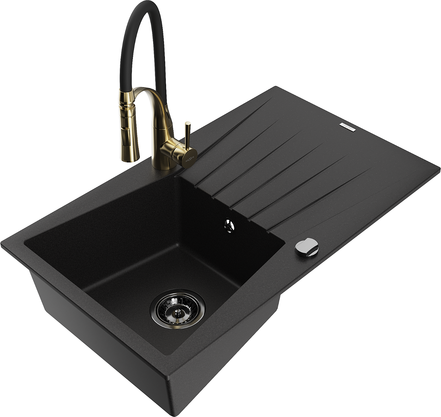 Mexen Cesar egytálcás gránit mosogató csepegtetővel és Aster konyhai csapteleppel, fekete - 6514-77-73450-57-B