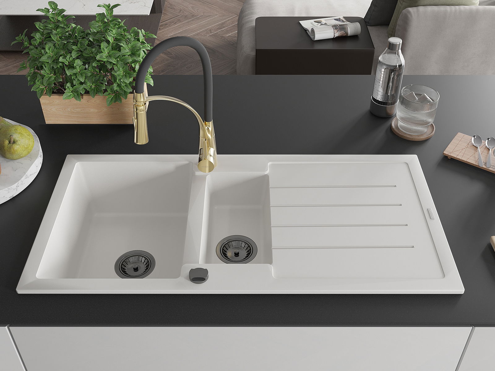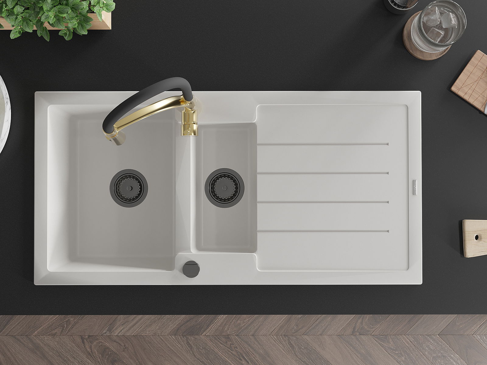 Mexen Andres 1,5-medencés gránit mosogató csepegtetővel és Aster konyhai csapteleppel, fehér - 6515-20-73450-57-B