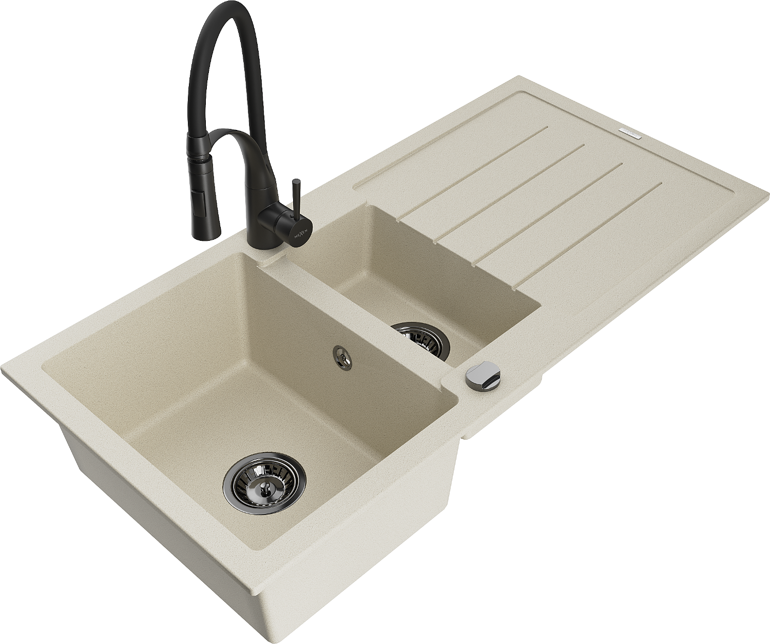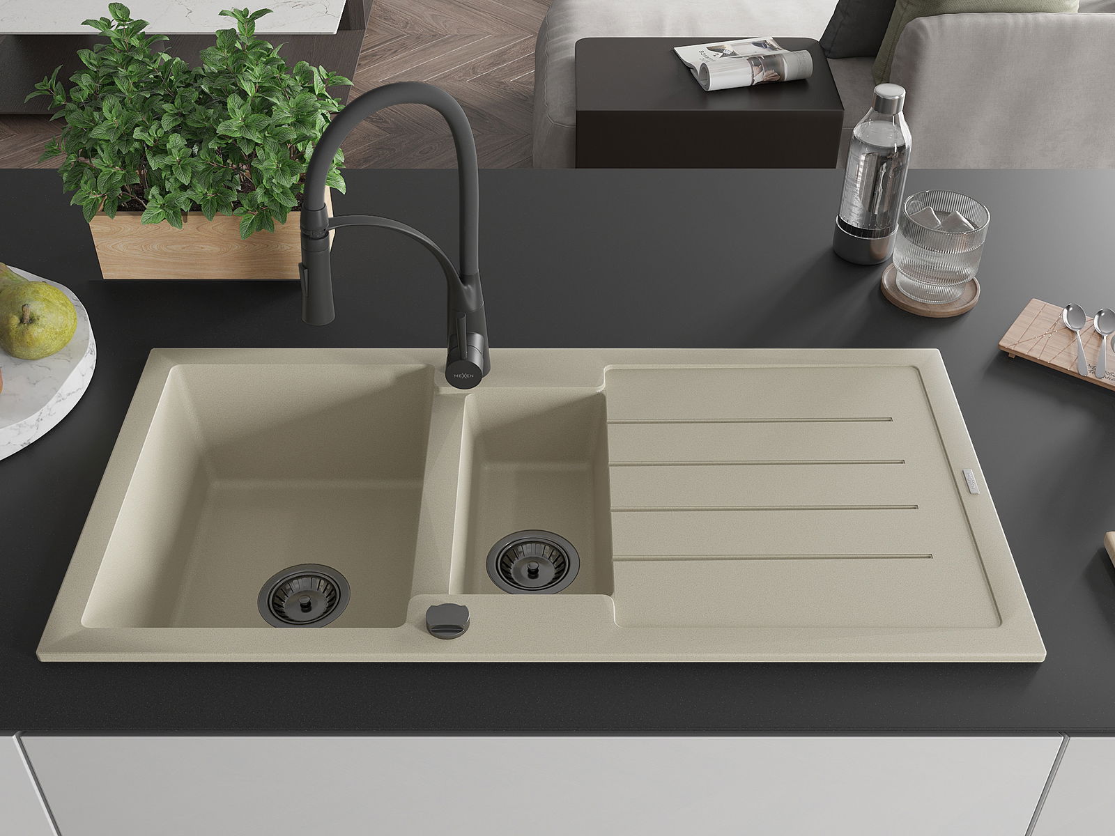 Mexen Andres 1,5-medencés gránit mosogató csepegtetővel és Aster konyhai csappal, bézs - 6515-69-73450-70-B