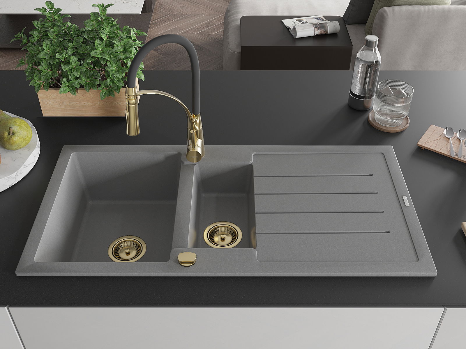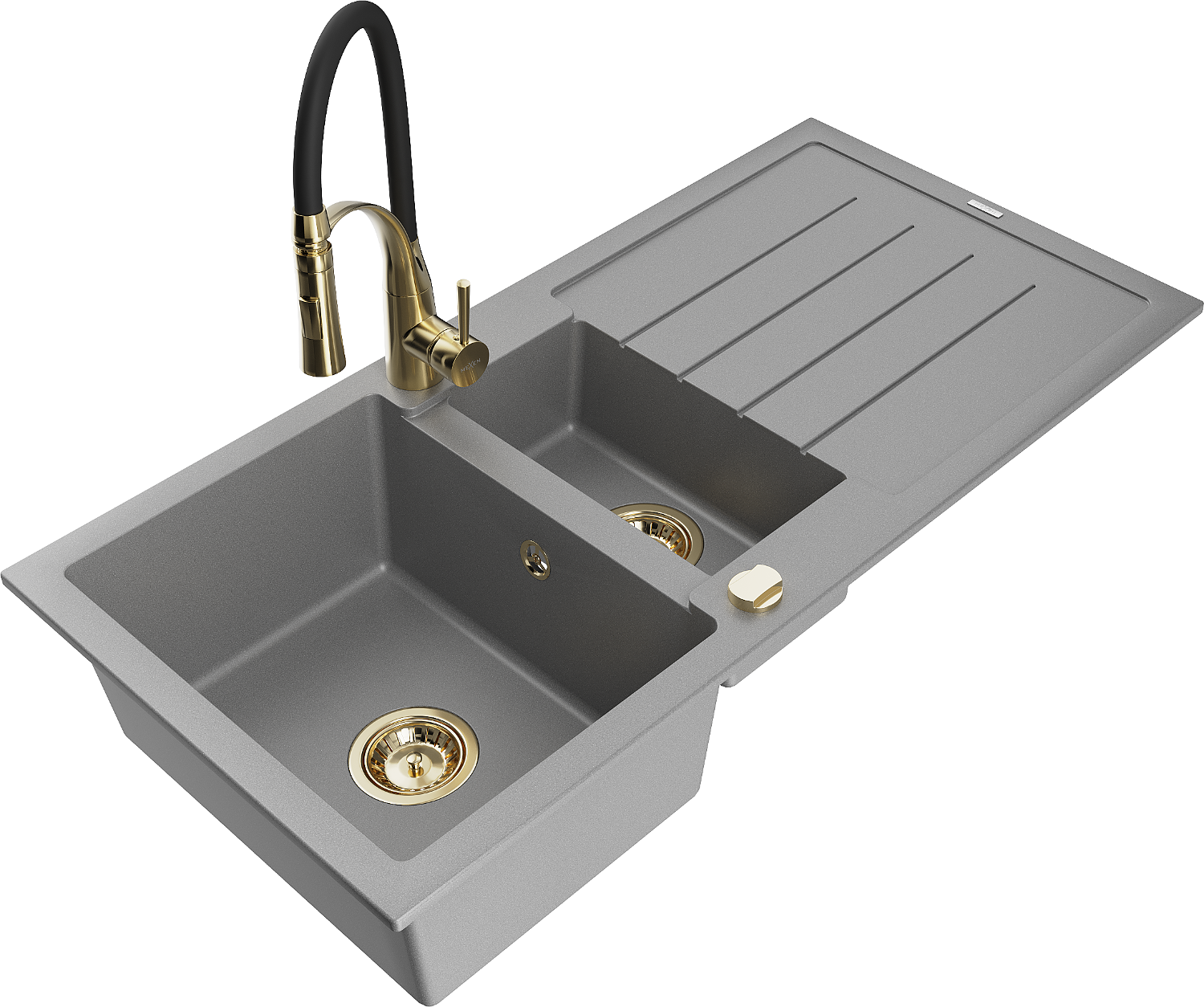 Mexen Andres 1,5-medencés gránit mosogató lefolyóval és Aster konyhai csapteleppel, szürke - 6515-71-73450-57-G
