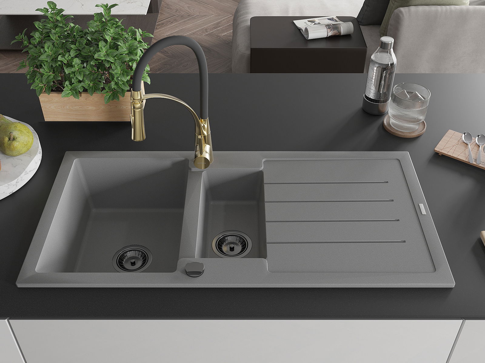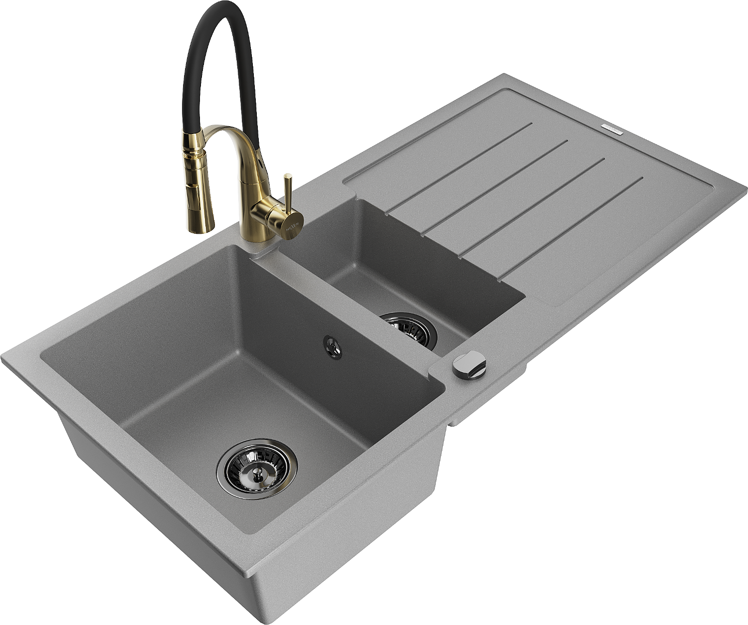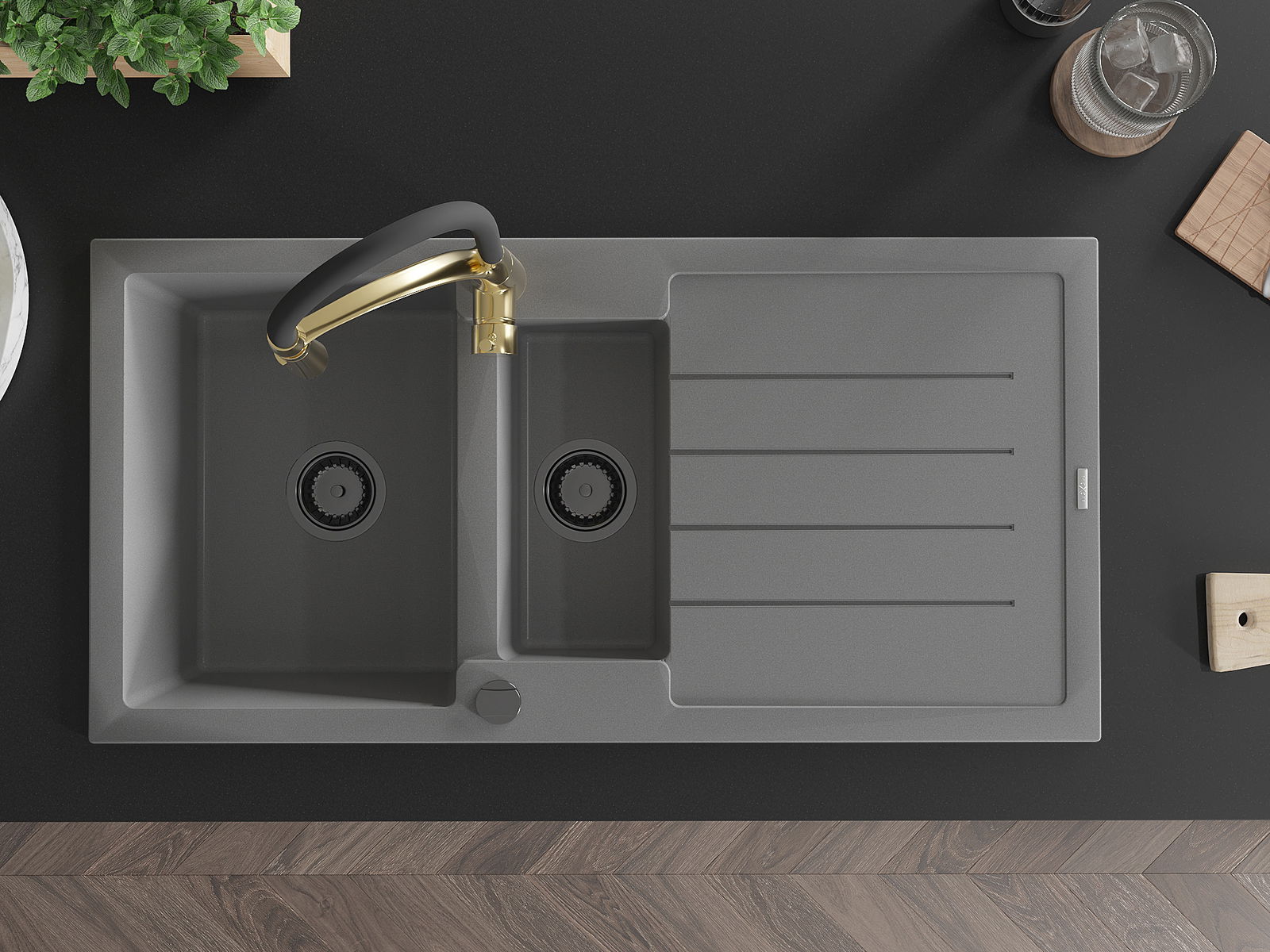 Mexen Andres gránit mosogatótálca 1,5 kamrás csepegtetővel és Aster konyhai csappal, szürke - 6515-71-73450-57-B