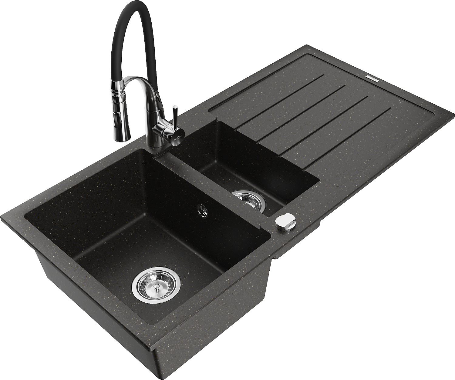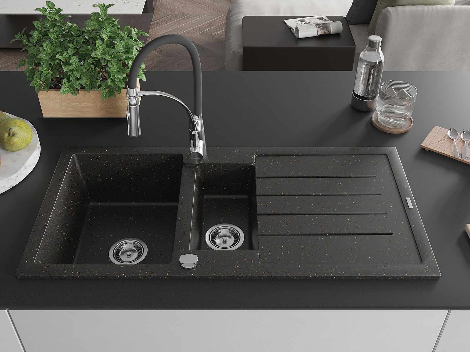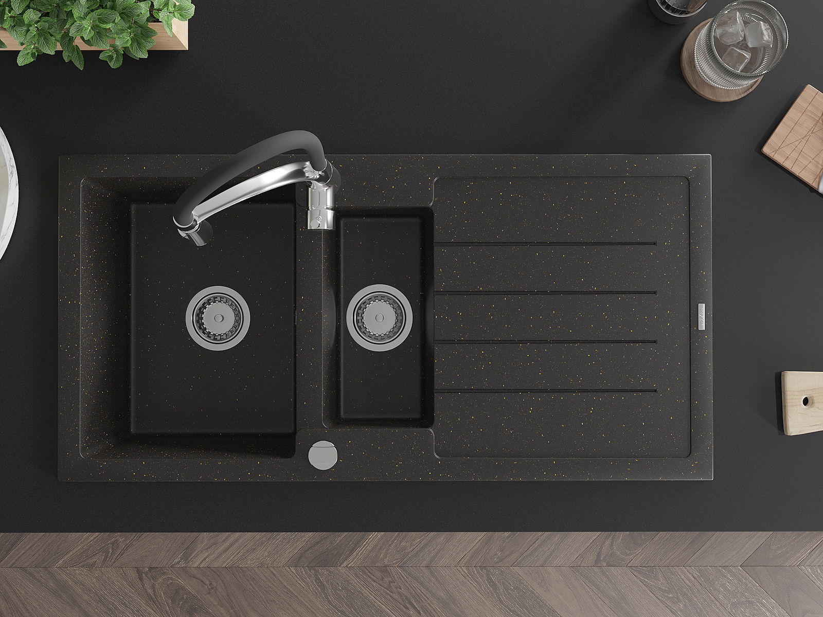 Mexen Andres 1,5 kamrás gránit mosogató csepptálcával és Aster konyhai csapteleppel, fekete/arany metál - 6515-75-73450-07