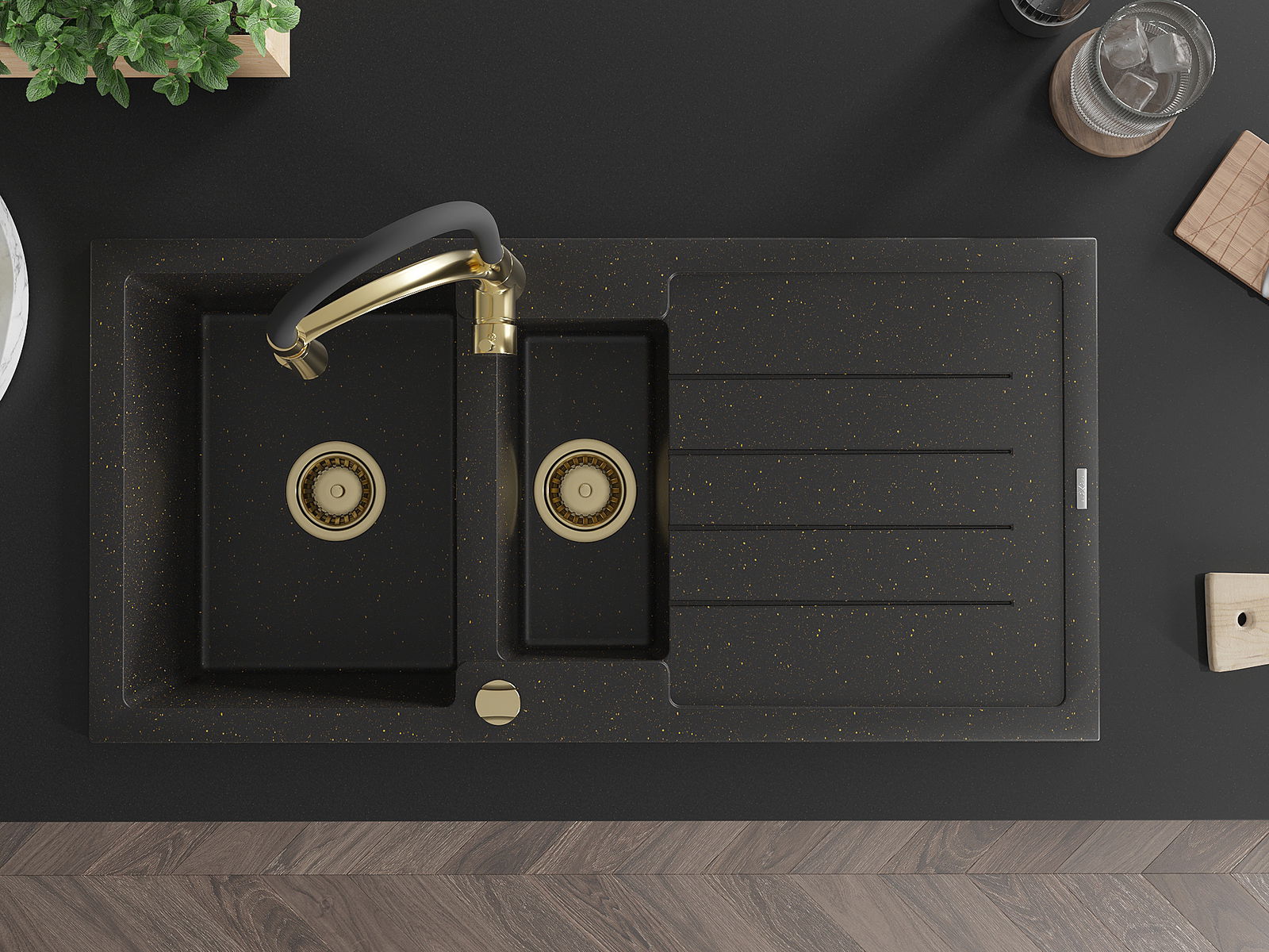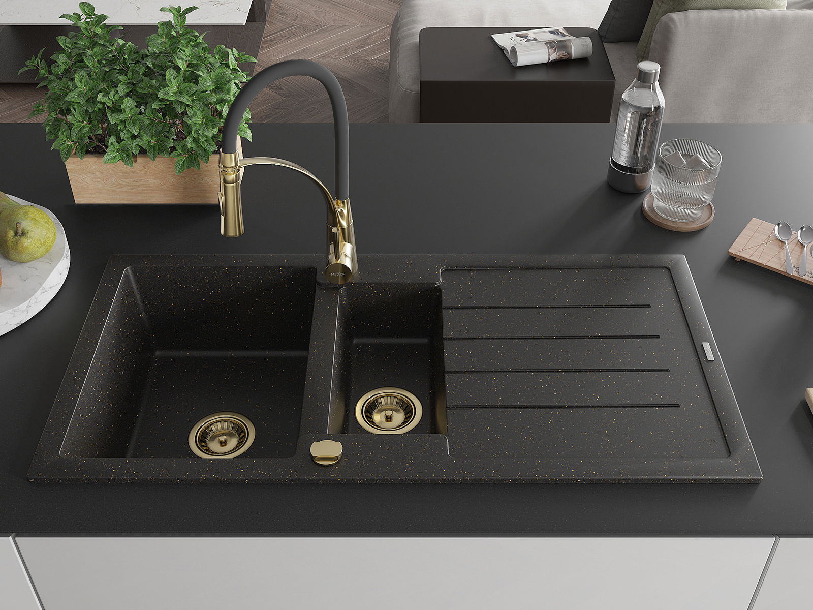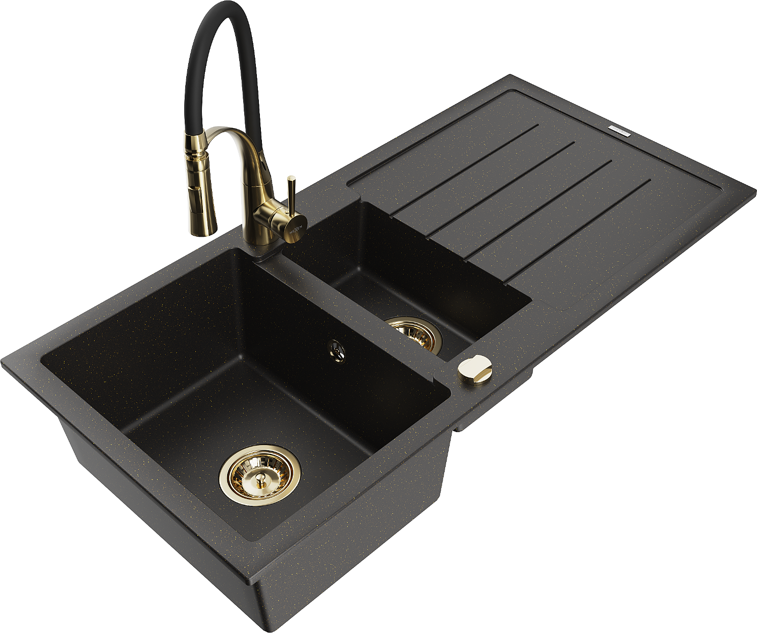 Mexen Andres 1,5-medencés gránit mosogató csepptálcával és Aster konyhai csapteleppel, fekete/arany metál - 6515-75-73450-57-G