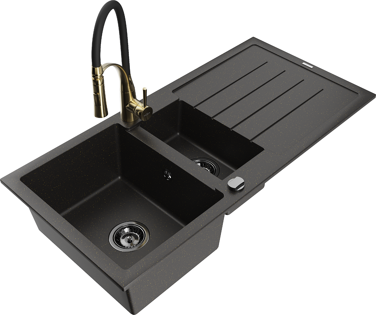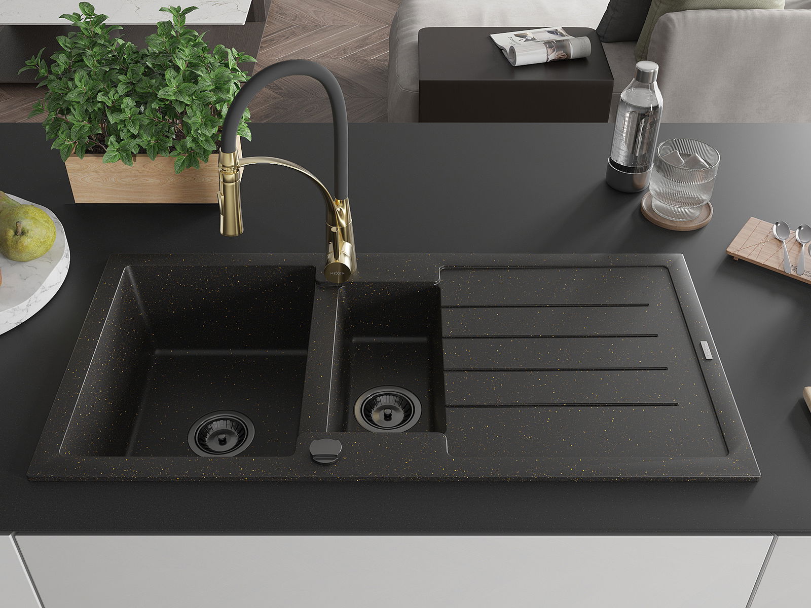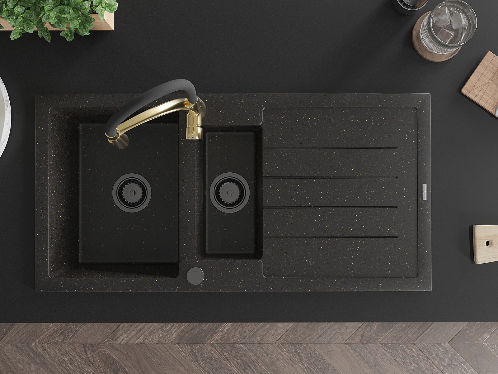 Mexen Andres gránit mosogató 1,5-medencés csepegtetővel és Aster konyhai csapteleppel, fekete/arany metál - 6515-75-73450-57-B