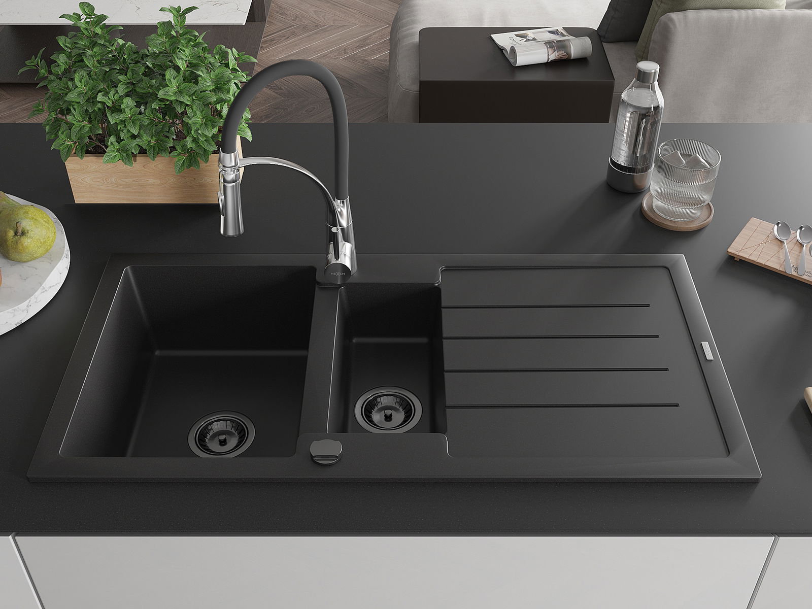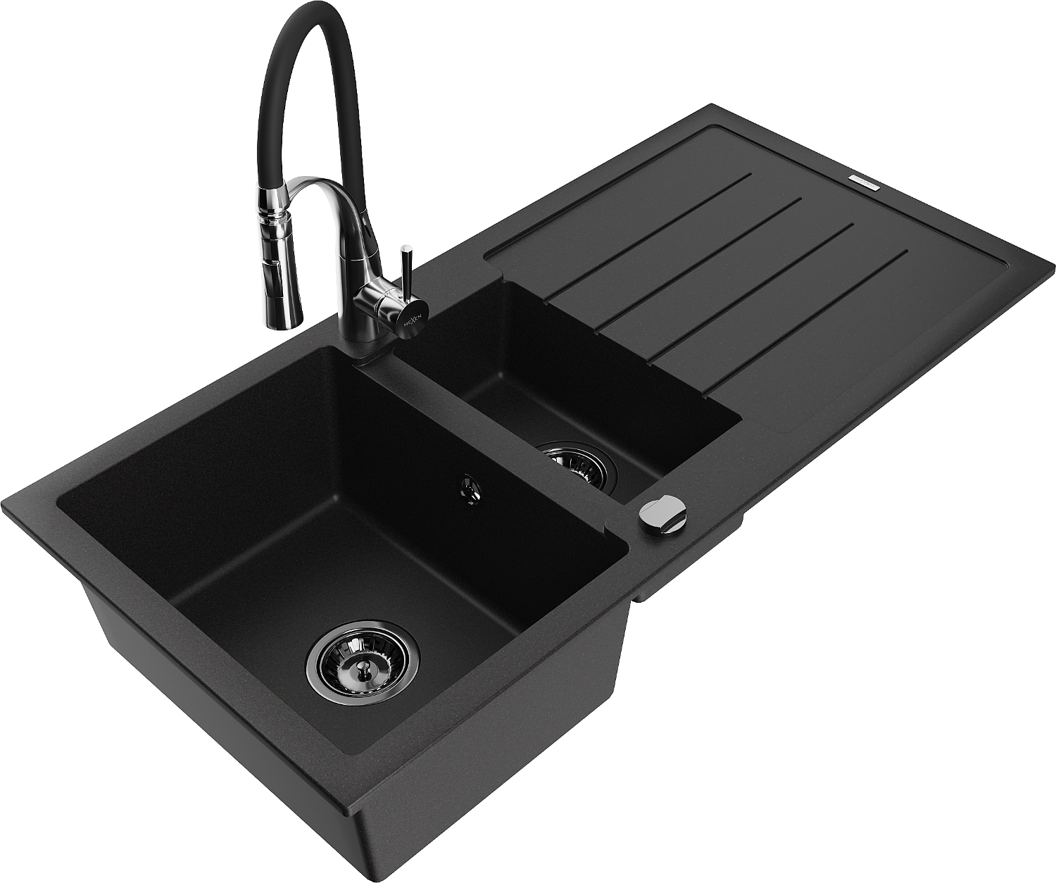 Mexen Andres 1,5 rekeszes gránit mosogató csepegtetővel és Aster konyhai csapteleppel, fekete - 6515-77-73450-07-B