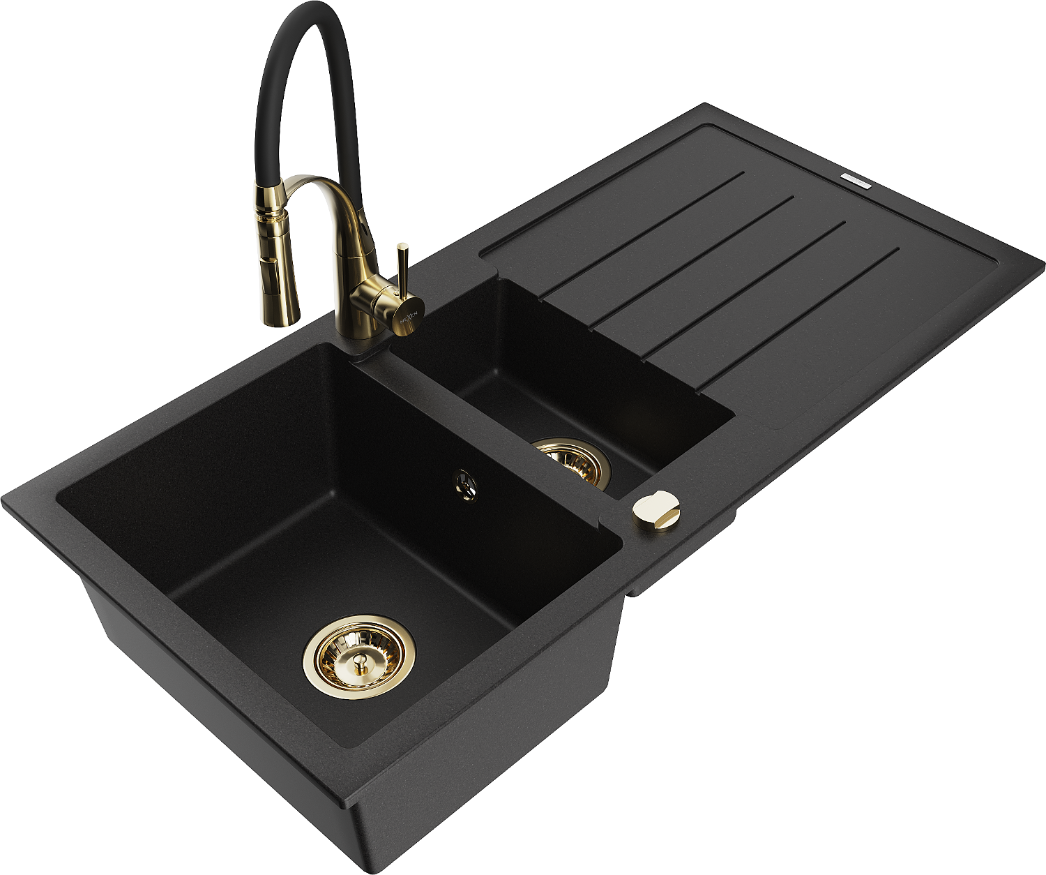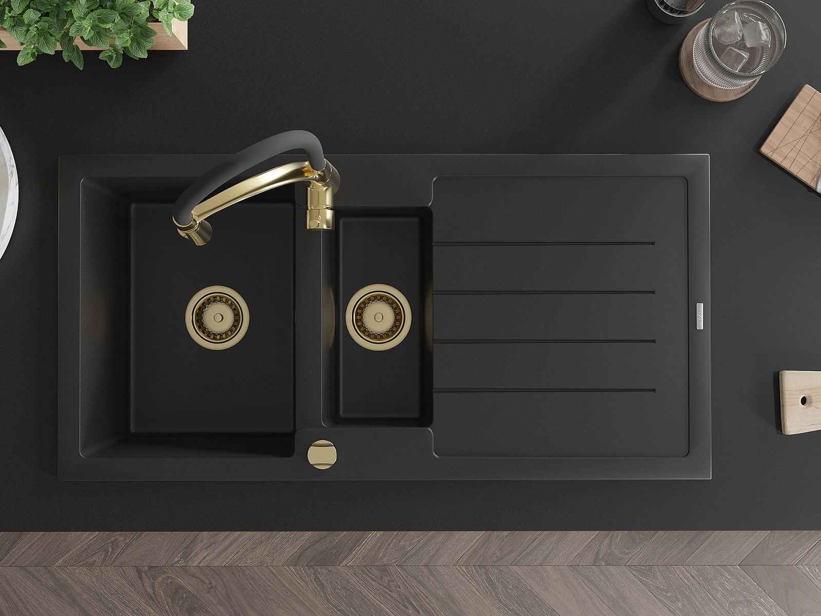 Mexen Andres gránit mosogató 1,5 medencével, csepegtetővel és Aster konyhai csappal, fekete - 6515-77-73450-57-G