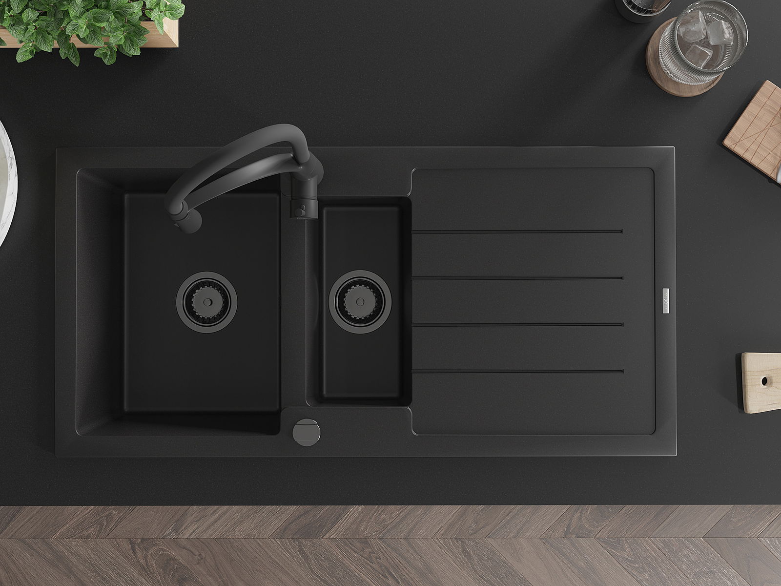 Mexen Andres 1,5 rekeszes gránit mosogató csepegtetővel és Aster konyhai csappal, fekete - 6515-77-73450-70-B