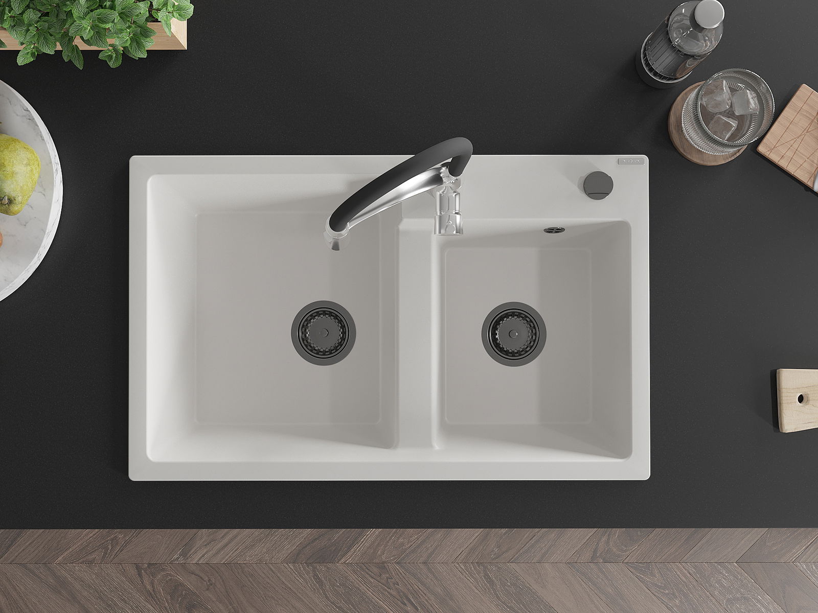 Mexen Tomas 2 rekeszes gránit mosogató Aster konyhai csapteleppel, fehér - 6516-20-73450-07-B