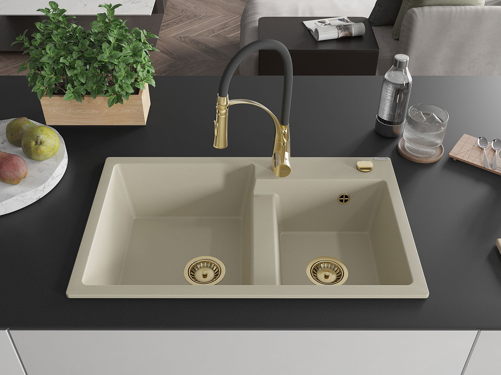 Mexen Tomas gránit 2-medencés mosogató Aster konyhai csapteleppel, bézs - 6516-69-73450-57-G