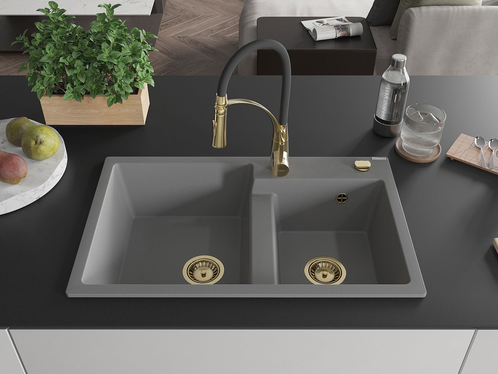Mexen Tomas szürke gránit 2 rekeszes mosogató Aster konyhai csapteleppel - 6516-71-73450-57-G