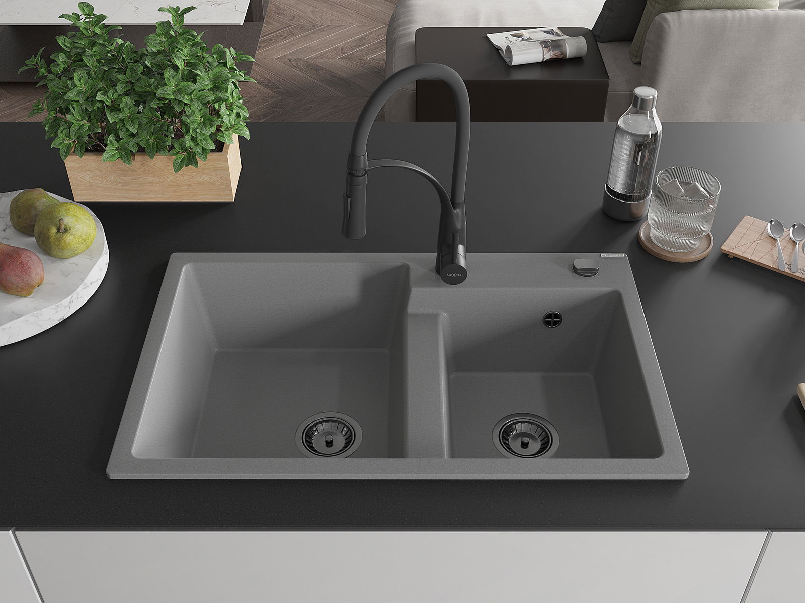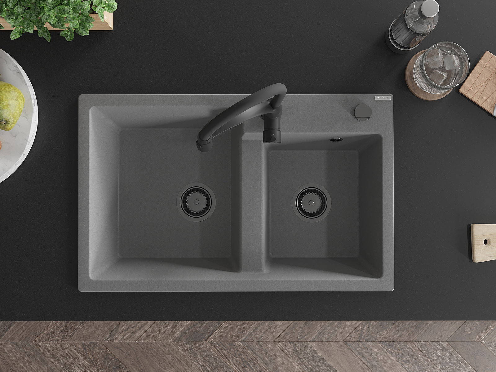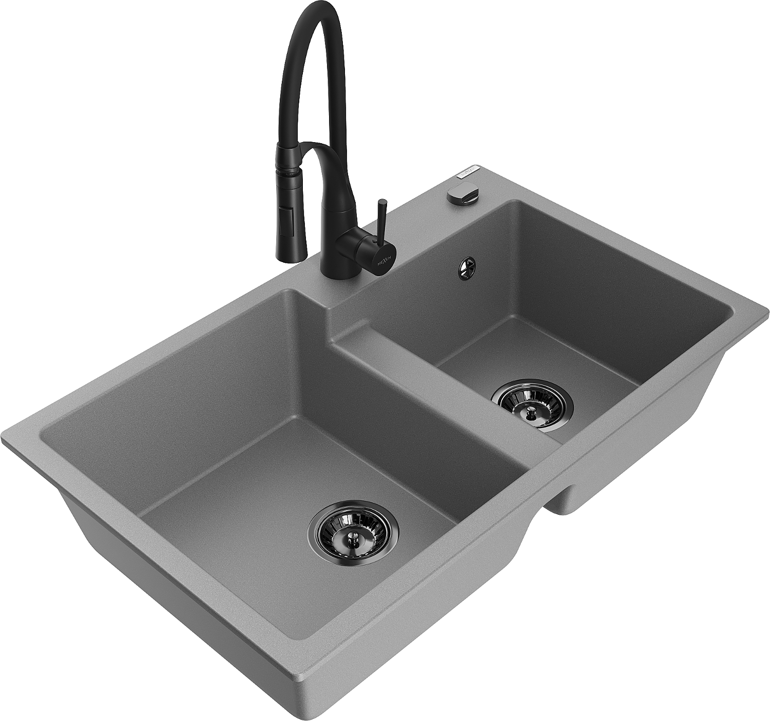 Mexen Tomas kétmedencés gránit mosogató Aster konyhai csapteleppel, szürke - 6516-71-73450-70-B