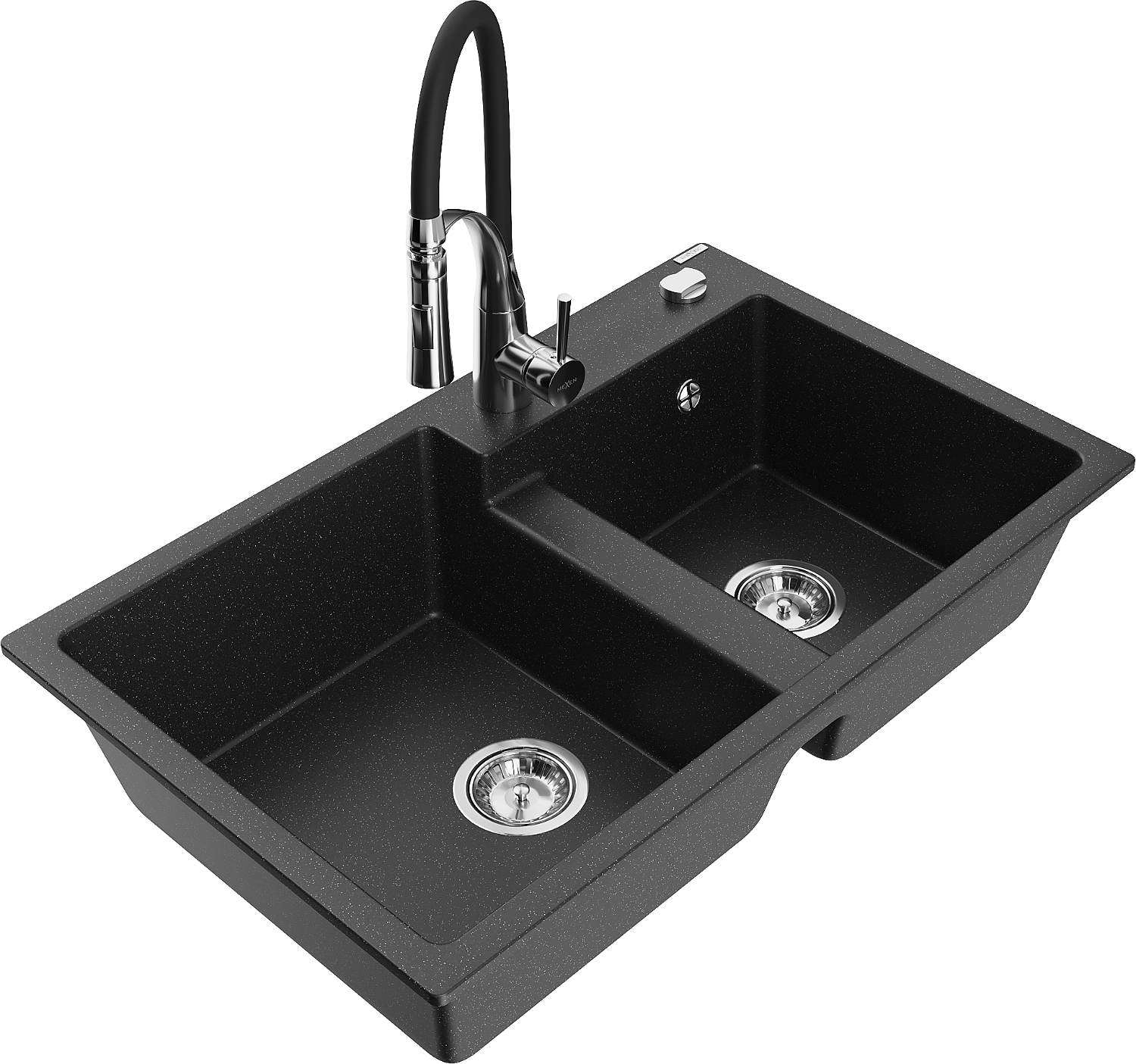 Mexen Tomas 2 rekeszes gránit mosogató Aster konyhai csapteleppel, fekete/ezüst metál - 6516-73-73450-07
