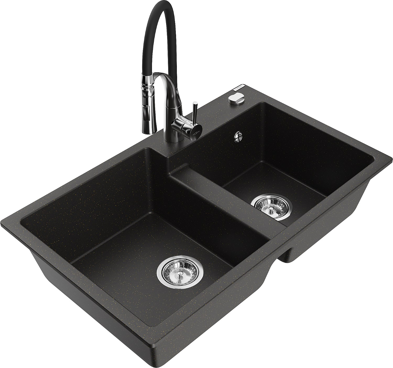 Mexen Tomas gránit mosogató 2-medencés, Aster konyhai csapteleppel, fekete/arany metál - 6516-75-73450-07