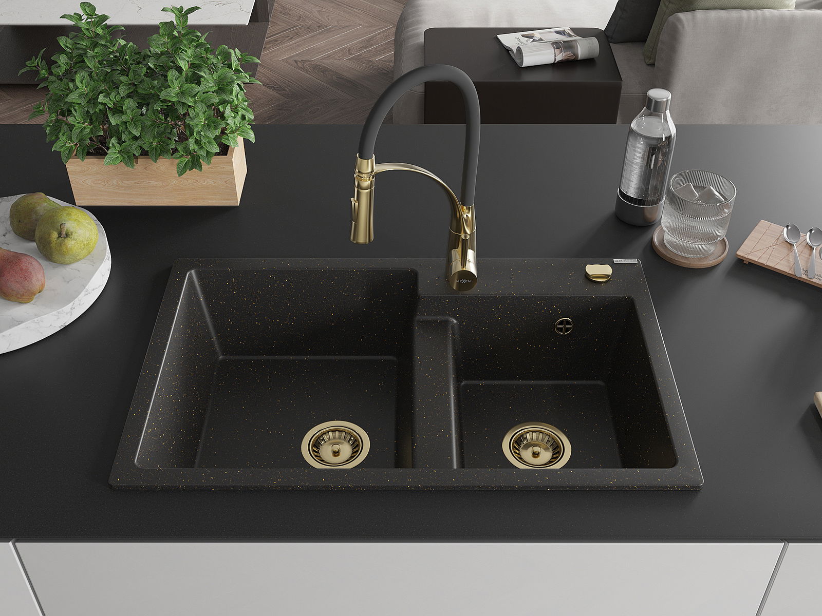 Mexen Tomas gránit mosogató 2 kamrás konyhai csappal Aster, fekete/arany metál - 6516-75-73450-57-G