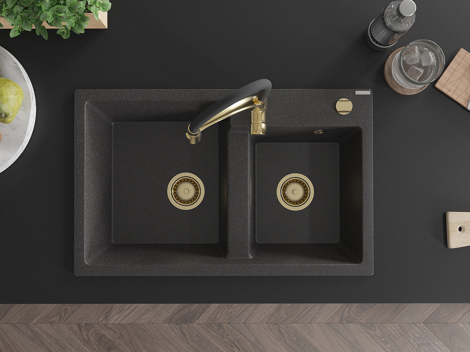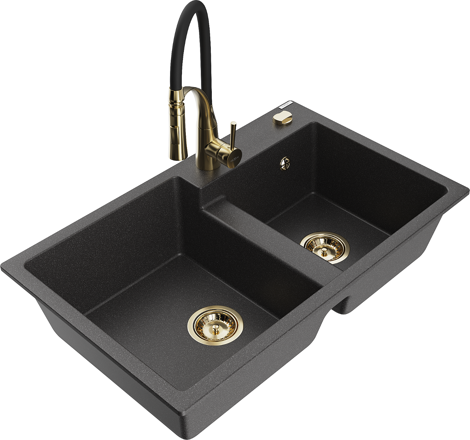 Mexen Tomas 2-medencés gránit mosogató Aster konyhai csapteleppel, fekete pöttyös - 6516-76-73450-57-G