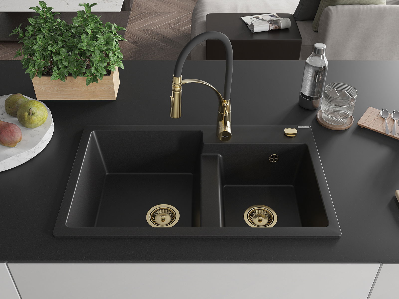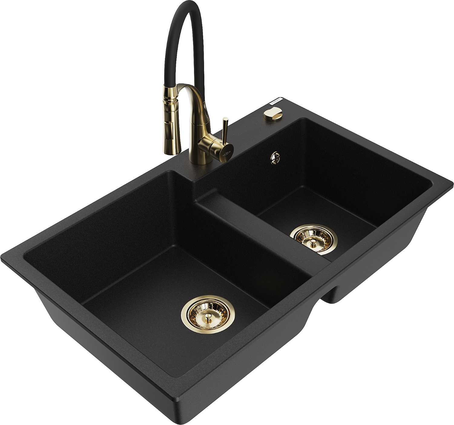 Mexen Tomas gránit 2-medencés mosogató Aster konyhai csapteleppel, fekete - 6516-77-73450-57-G