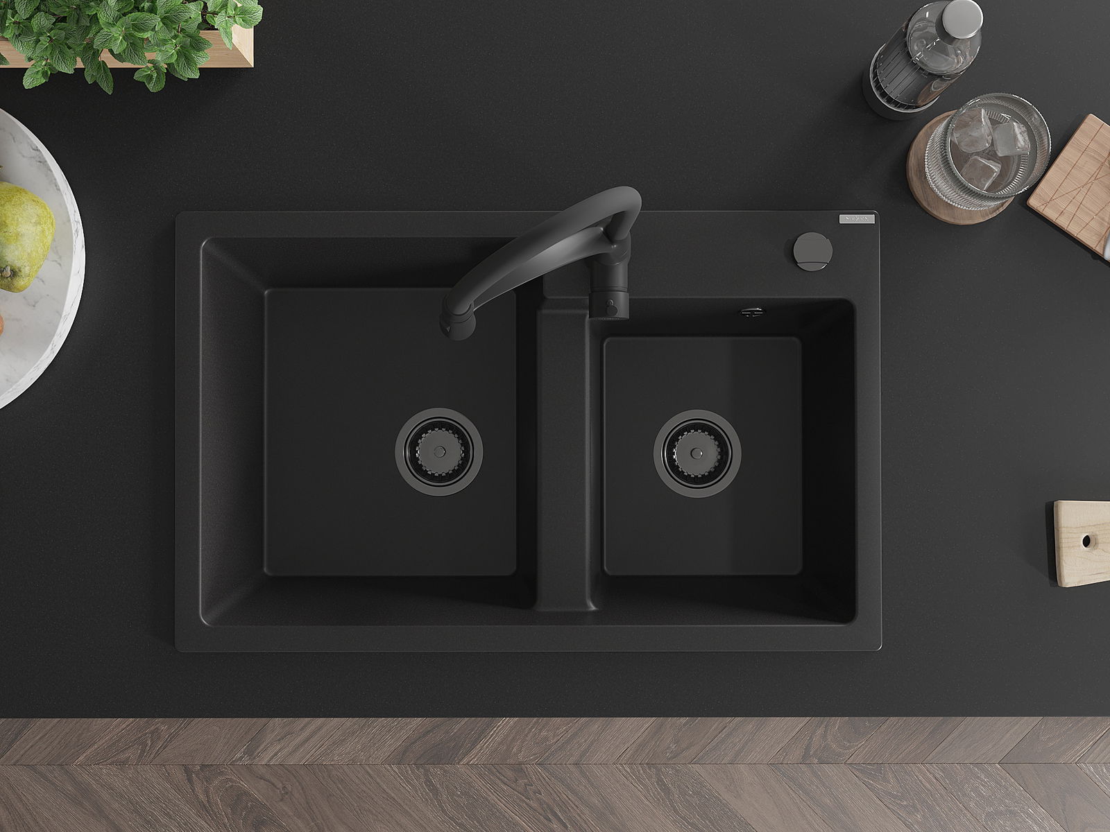 Mexen Tomas gránit konyhai mosogató 2-medencével, Aster konyhai csappal, fekete - 6516-77-73450-70-B
