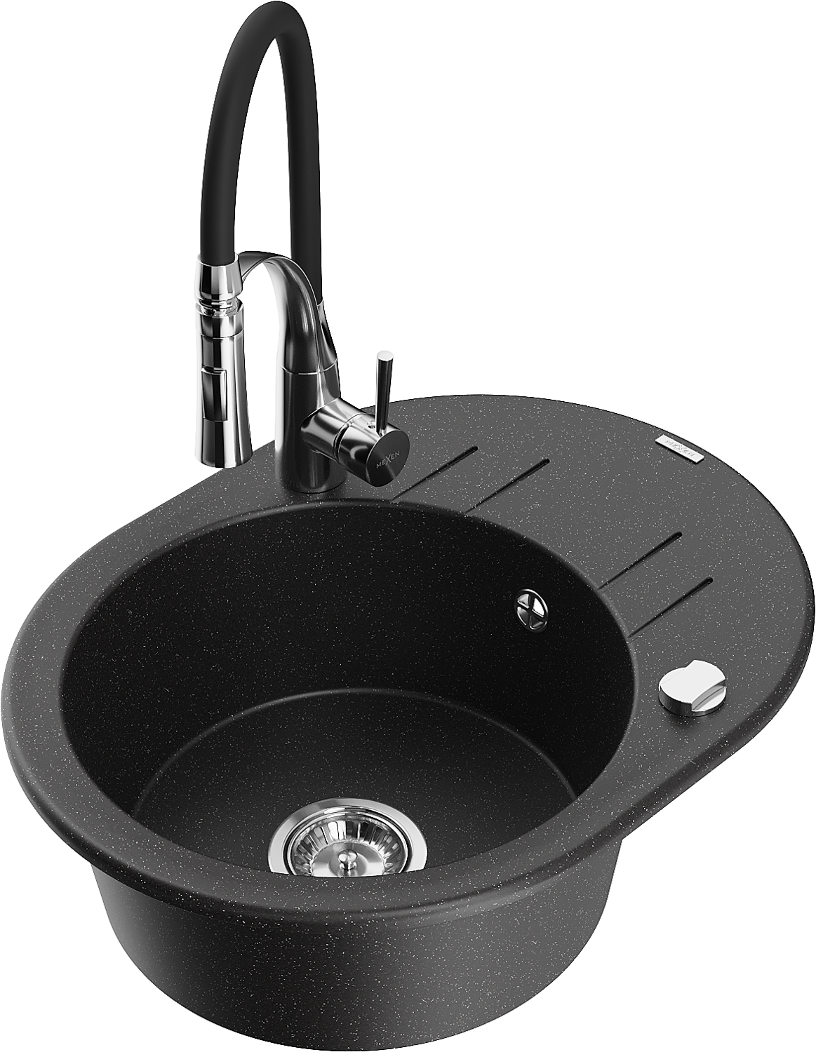 Mexen Kevin egykamrás gránit mosogató csepegtetővel és Aster konyhai csappal, fekete/ezüst metál - 6517-73-73450-07