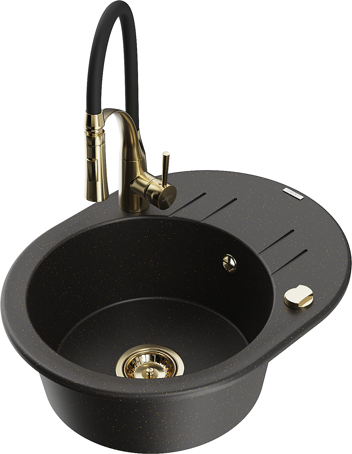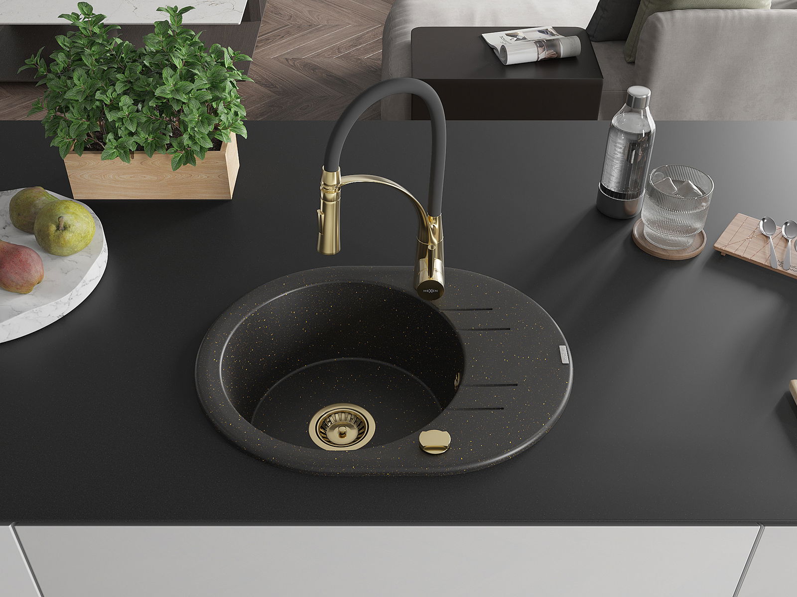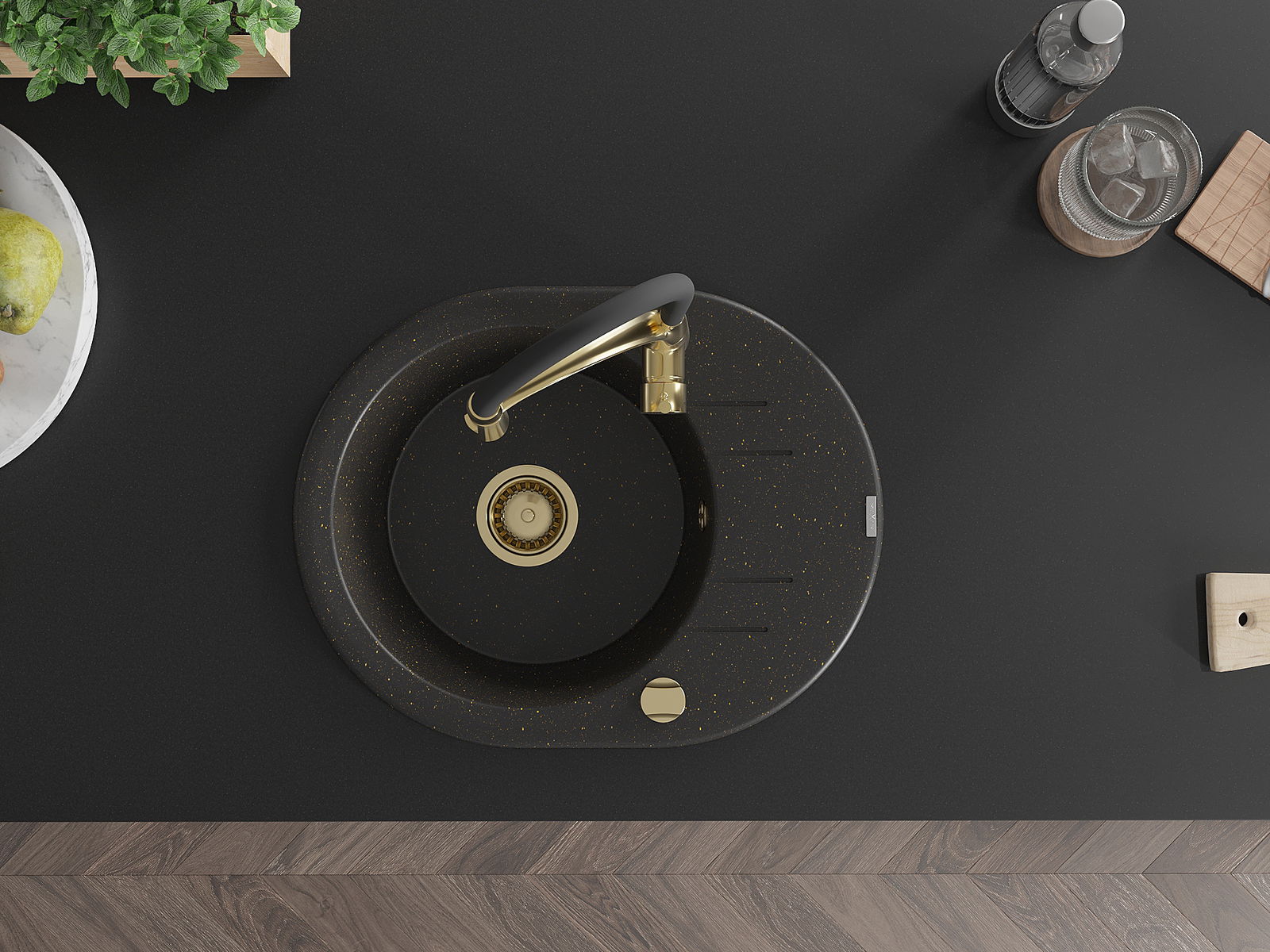 Mexen Kevin gránit mosogató 1-medencés csepegtetővel és Aster konyhai csapteleppel, fekete/arany metál - 6517-75-73450-57-G
