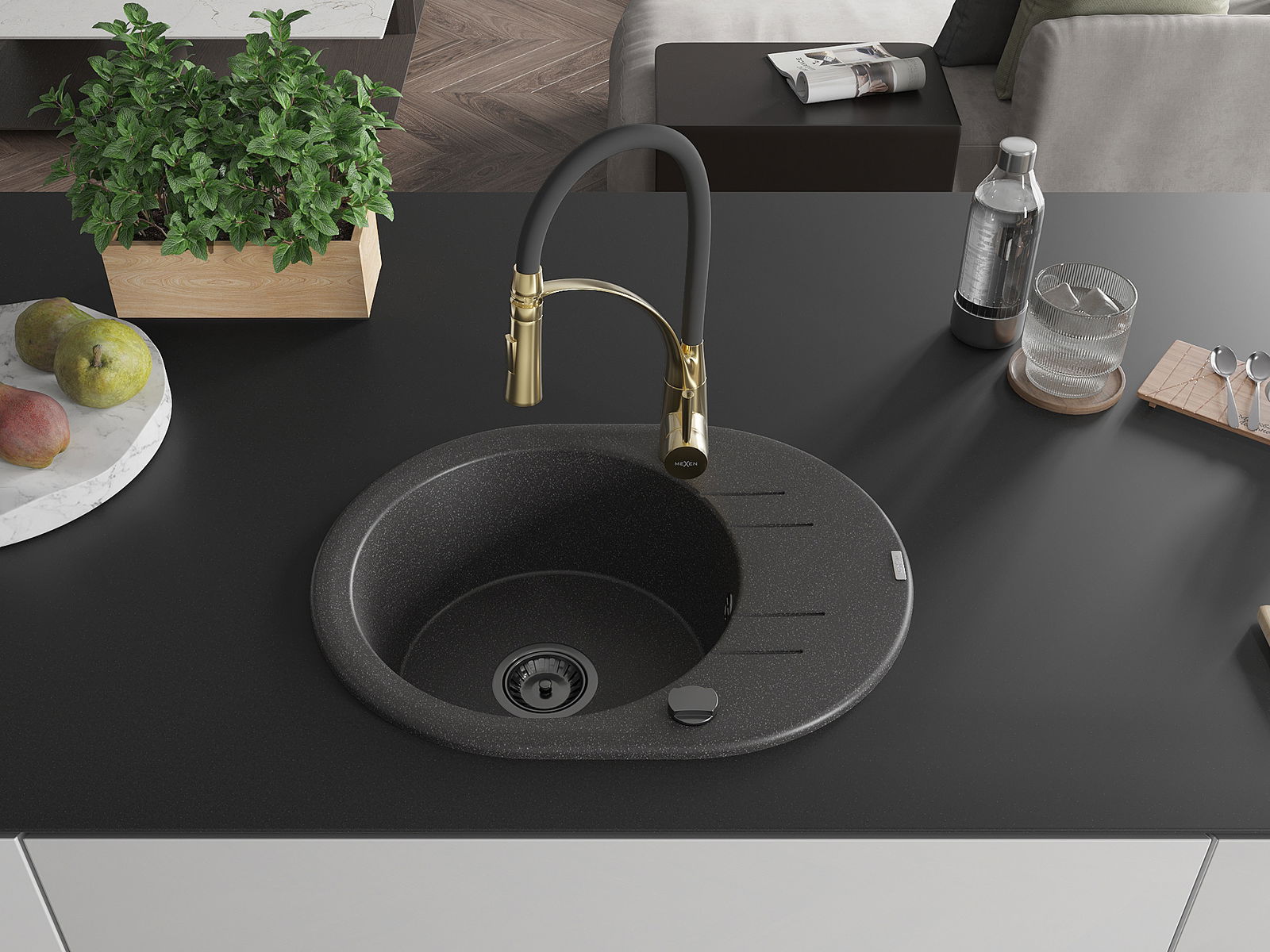 A mosogató magas minőségű gránitból készült. Elegáns, de mindenekelőtt praktikus kiegészítője minden konyhának, függetlenül annak stílusától. A gránit magas minősége és tartóssága hosszú távú használatot biztosít.