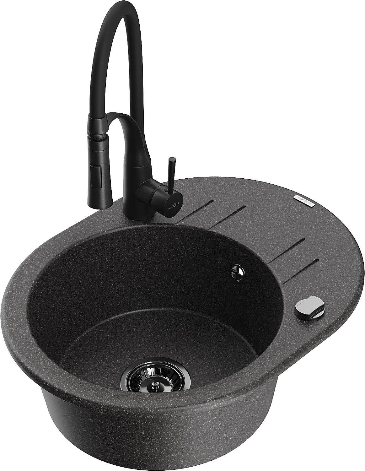 Mexen Kevin gránit mosogató 1-medencés csepegtetővel és Aster konyhai csapteleppel, fekete pöttyös - 6517-76-73450-70-B