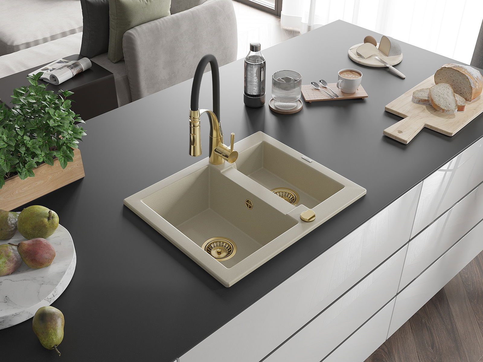 A mosogató kiváló minőségű gránitból készül. Ez egy elegáns és mindenekelőtt minden konyhához praktikus kiegészítés, stílusától függetlenül. A kiváló minőségű és a gránit tartósság biztosítja a sok éves használatát.