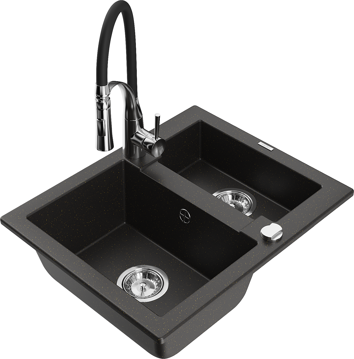 Mexen Carlos gránit mosogató 1,5-medencés Aster konyhai csapteleppel, fekete/arany metál - 6518-75-73450-07