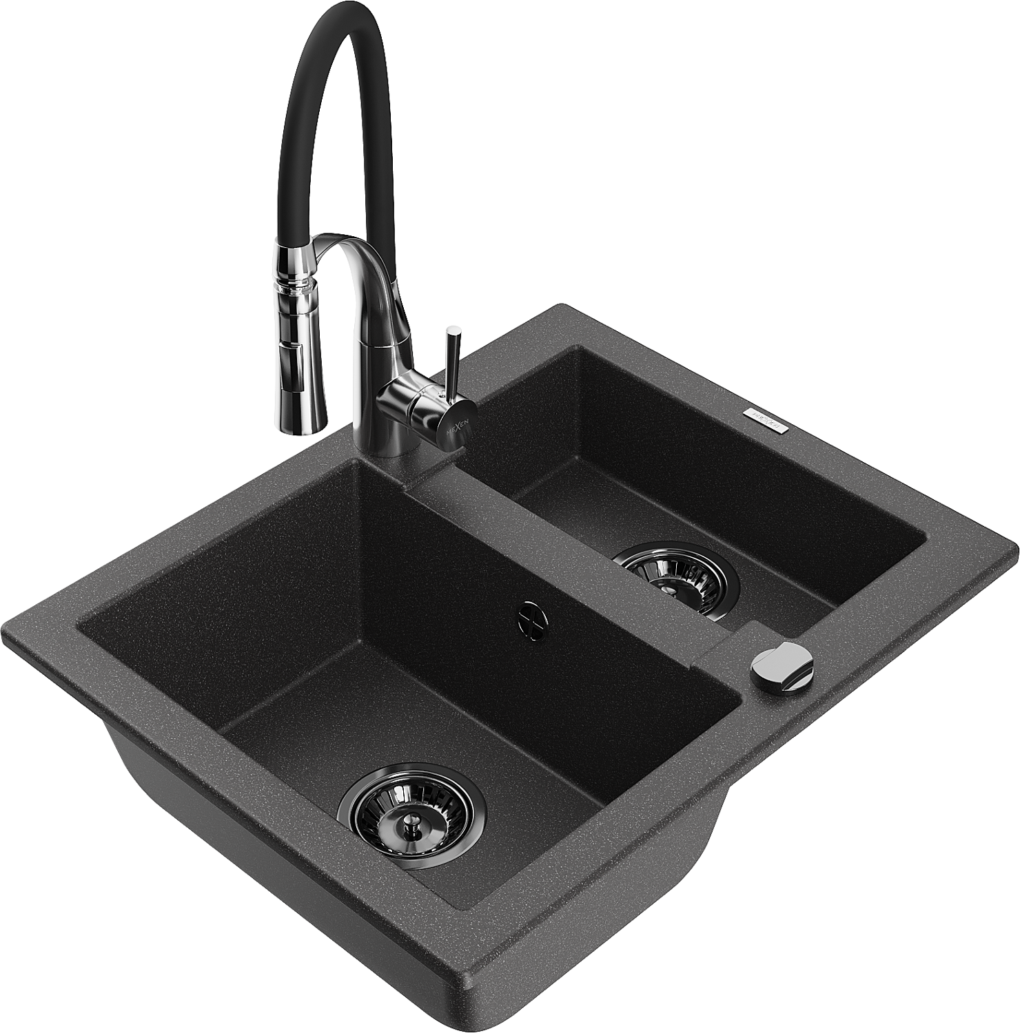 Mexen Carlos gránit mosogató 1,5 rekeszes konyhai csapteleppel Aster, fekete pöttyös - 6518-76-73450-07-B
