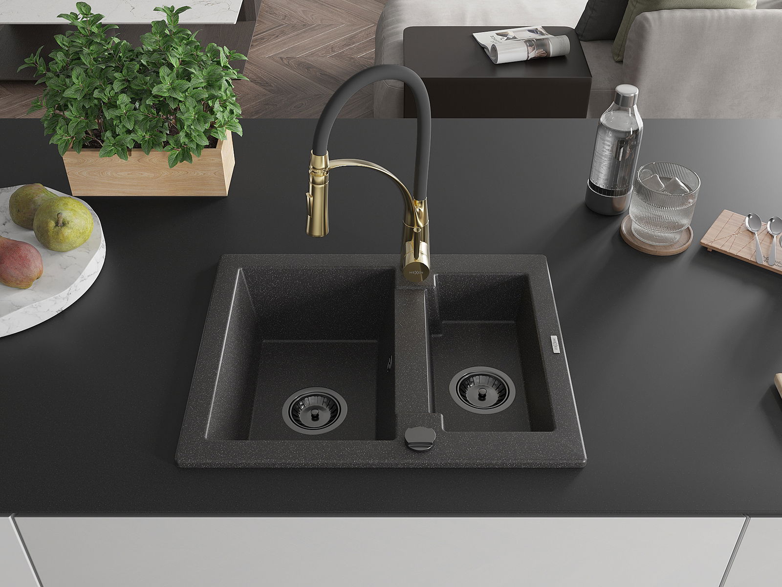 Mexen Carlos 1,5 medencés gránit mosogató Aster konyhai csappal, fekete pettyes - 6518-76-73450-57-B