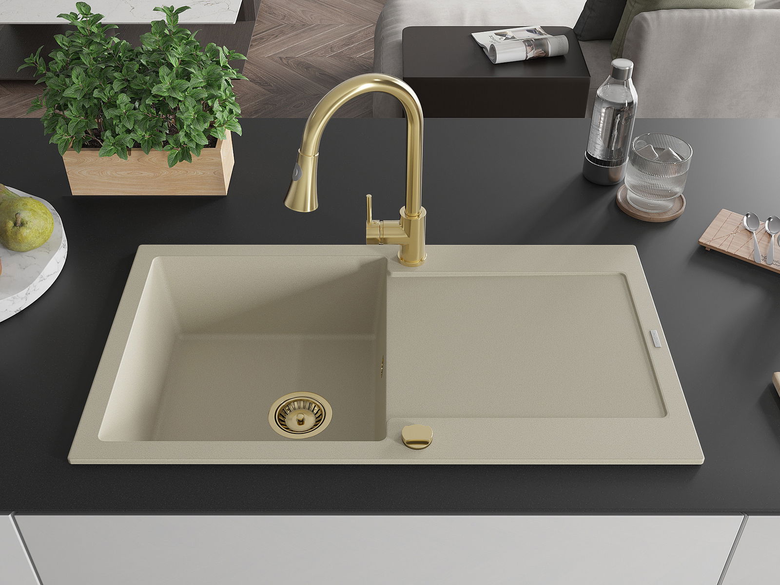 A mosogató kiváló minőségű gránitból készül. Ez egy elegáns és mindenekelőtt minden konyhához praktikus kiegészítés, stílusától függetlenül. A kiváló minőségű és a gránit tartósság biztosítja a sok éves használatát.