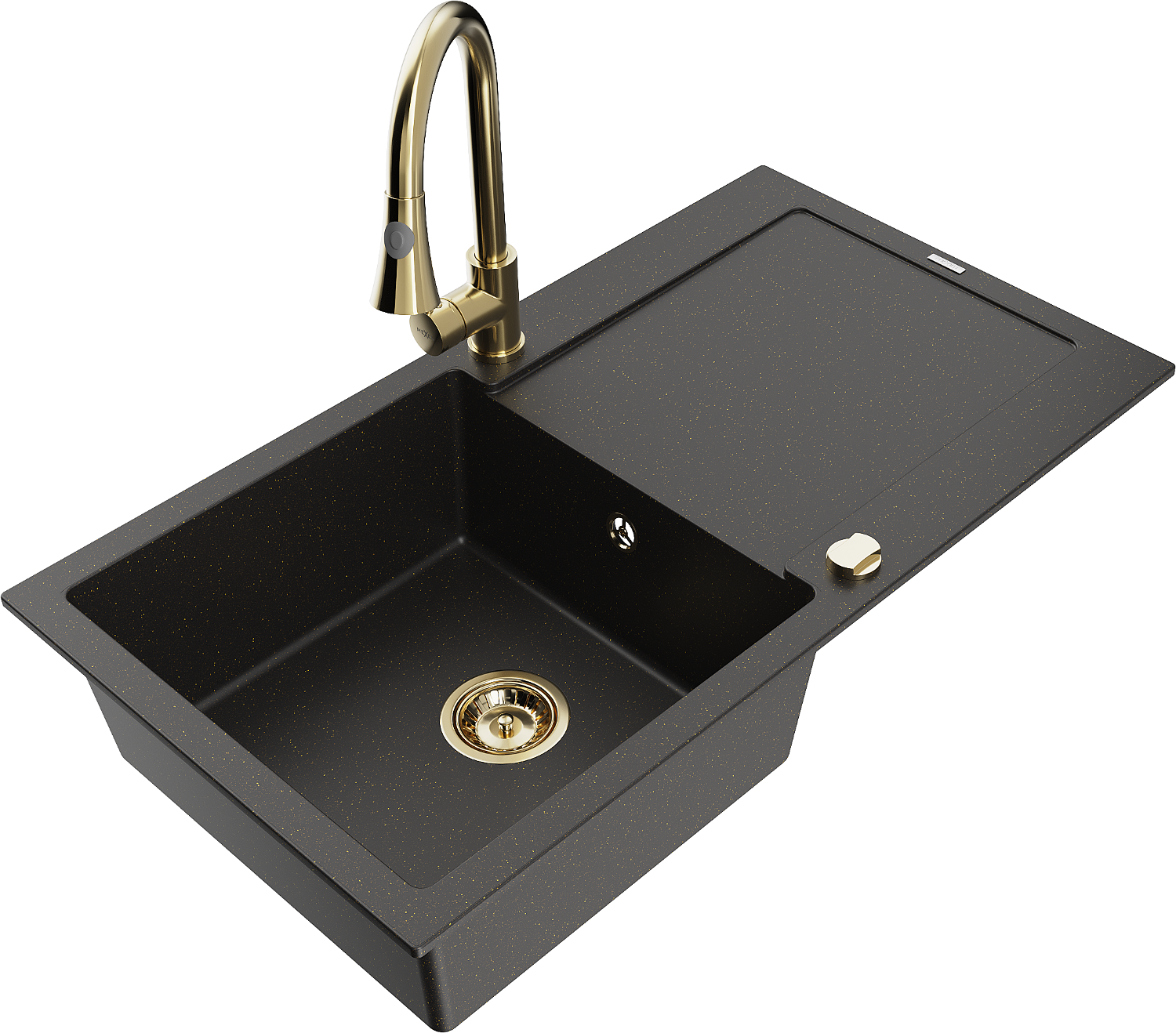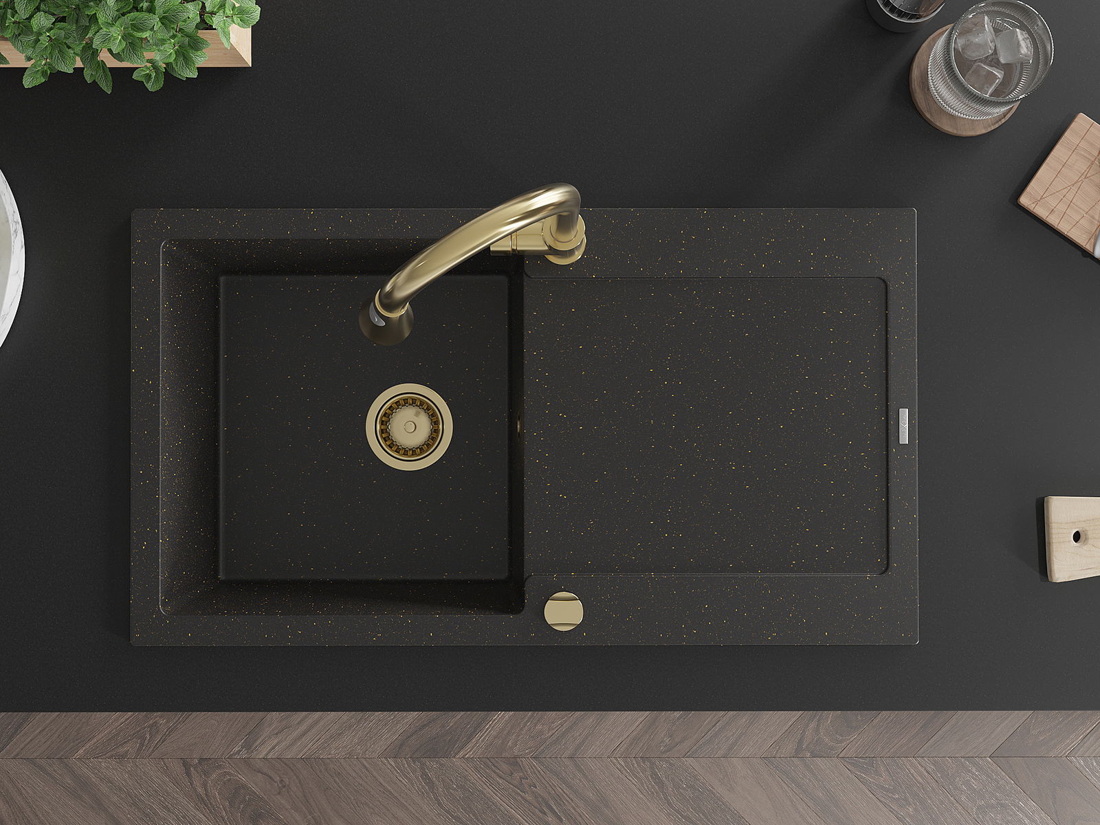 Mexen Leo egykamrás gránit mosogató csepegtetővel és Elia konyhai csapteleppel, fekete/arany metál - 6501-75-670101-50