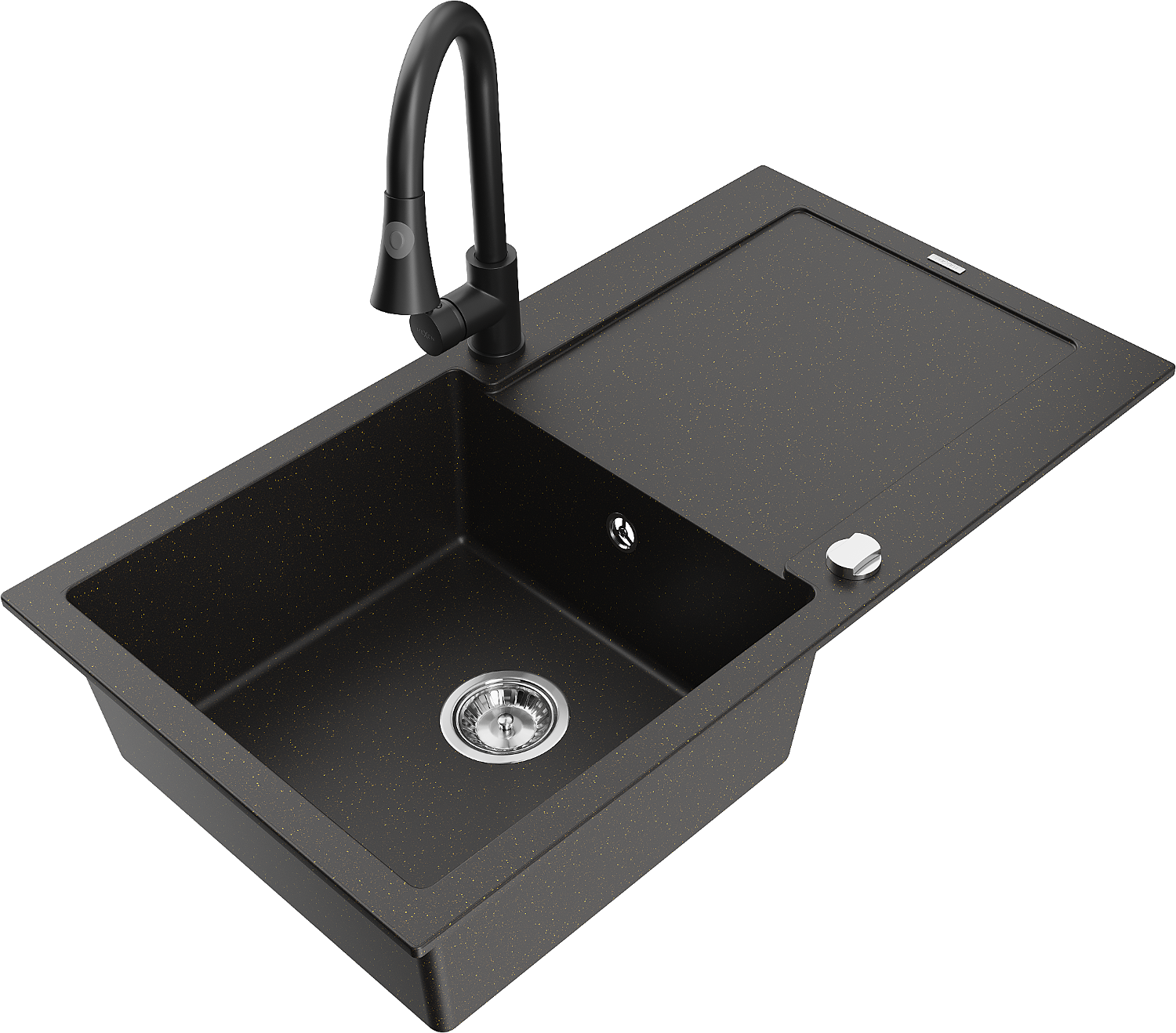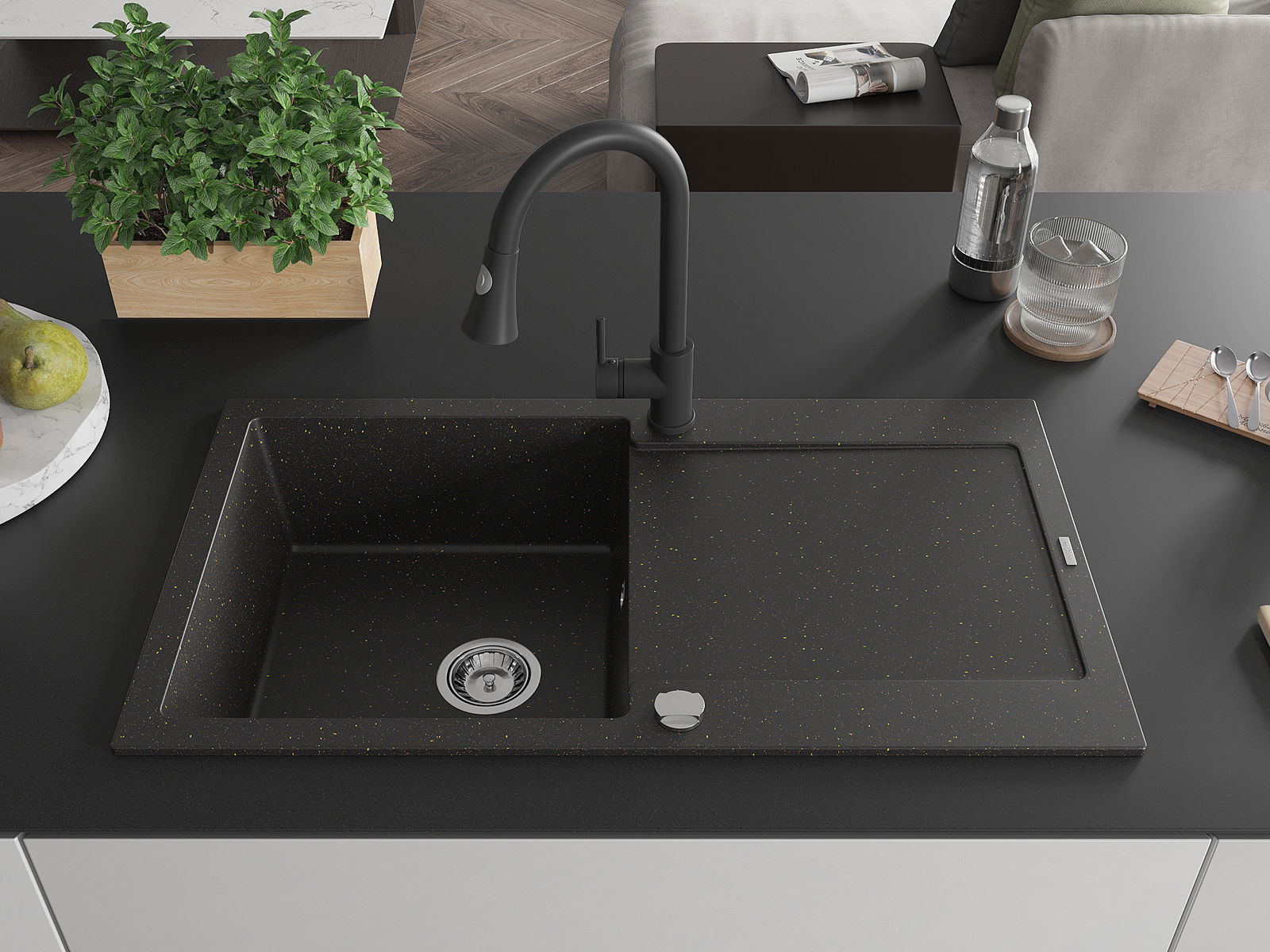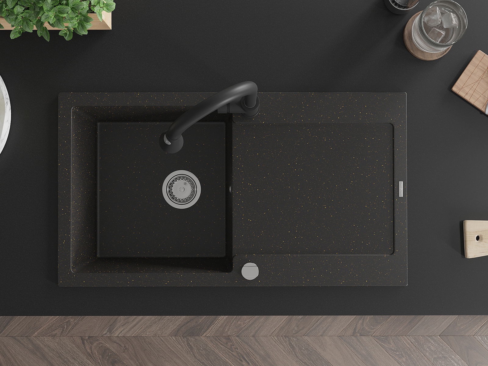 Mexen Leo 1-medencés, csöpögtetős gránit mosogató Elia konyhai csapteleppel, fekete/arany metál - 6501-75-670101-70