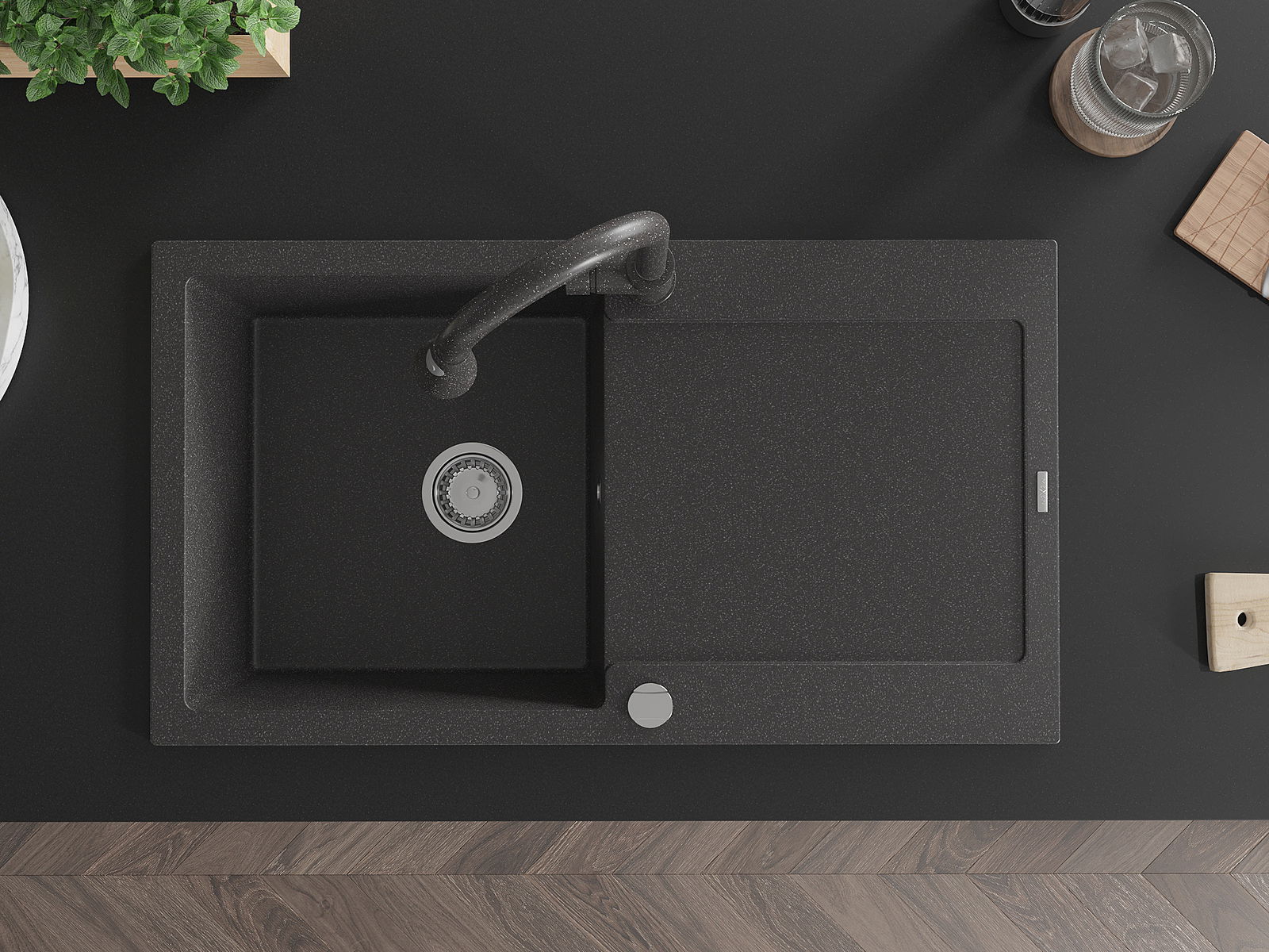 A mosogató kiváló minőségű gránitból készül. Ez egy elegáns és mindenekelőtt minden konyhához praktikus kiegészítés, stílusától függetlenül. A kiváló minőségű és a gránit tartósság biztosítja a sok éves használatát.