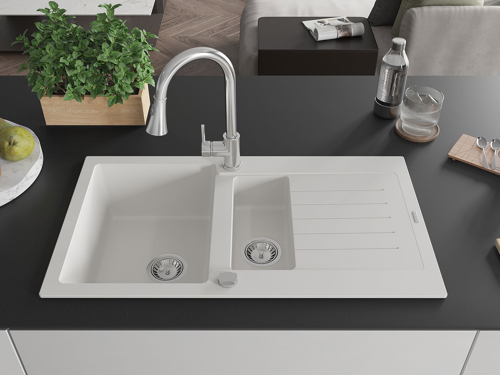 Mexen Matias konyhai gránit mosogató 1,5 medencés csepegtetővel és Elia konyhai csappal, fehér - 6502-20-670101-00