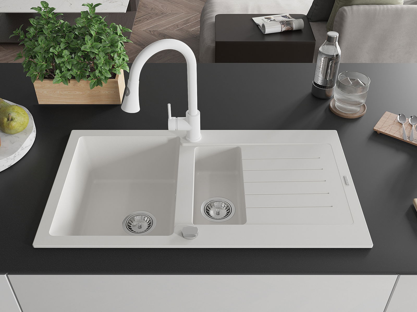 Mexen Matias gránit mosogató 1,5 rekeszes csepegtetővel és Elia konyhai csappal, fehér - 6502-20-670101-20