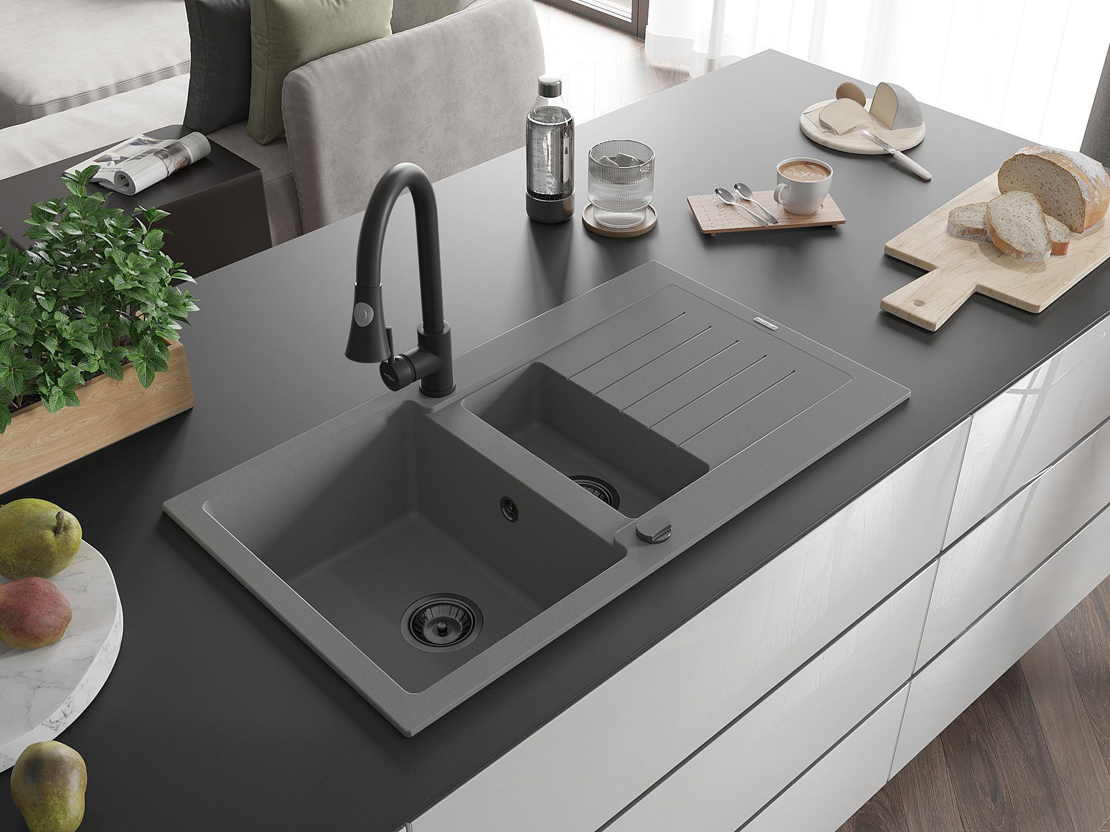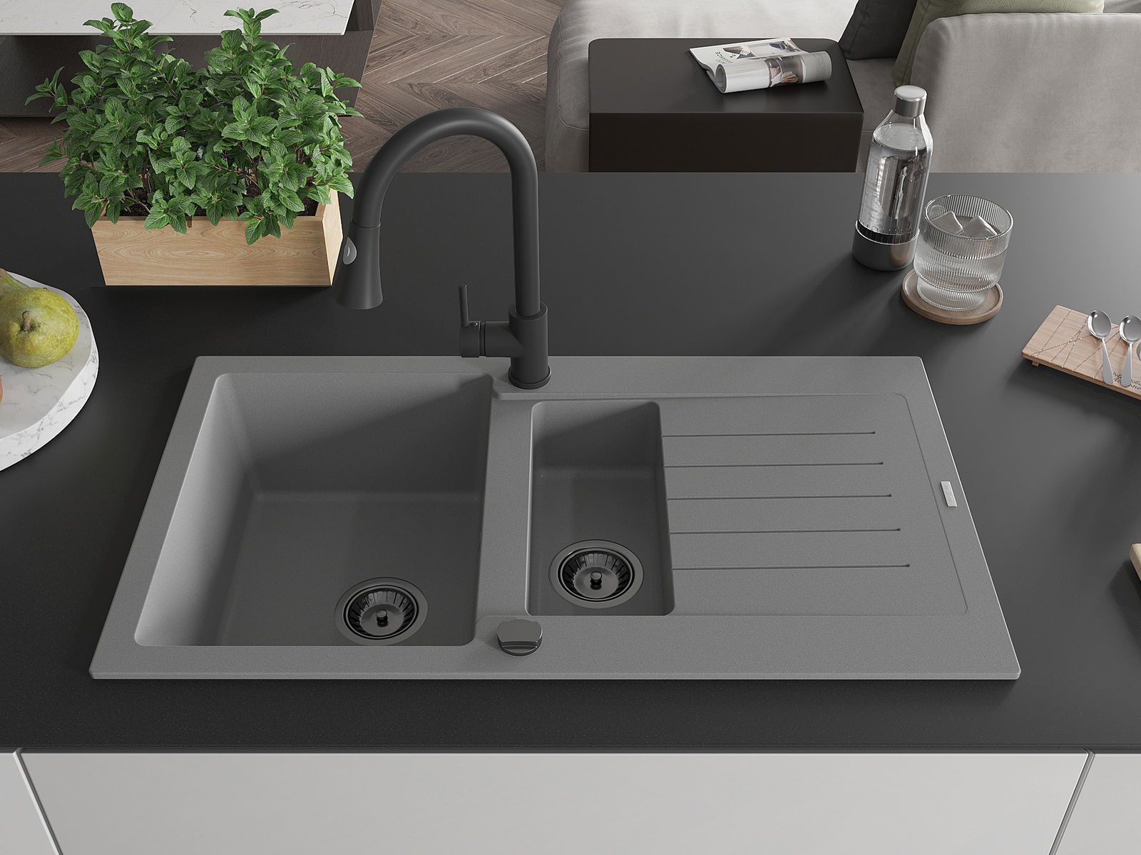 A mosogató kiváló minőségű gránitból készül. Ez egy elegáns és mindenekelőtt minden konyhához praktikus kiegészítés, stílusától függetlenül. A kiváló minőségű és a gránit tartósság biztosítja a sok éves használatát.