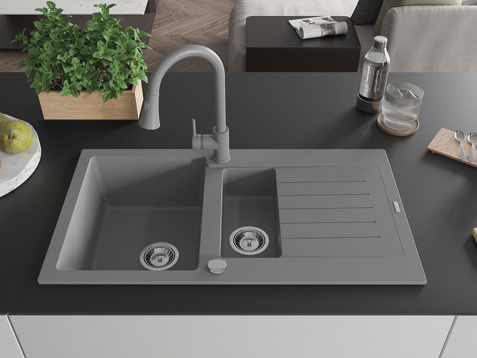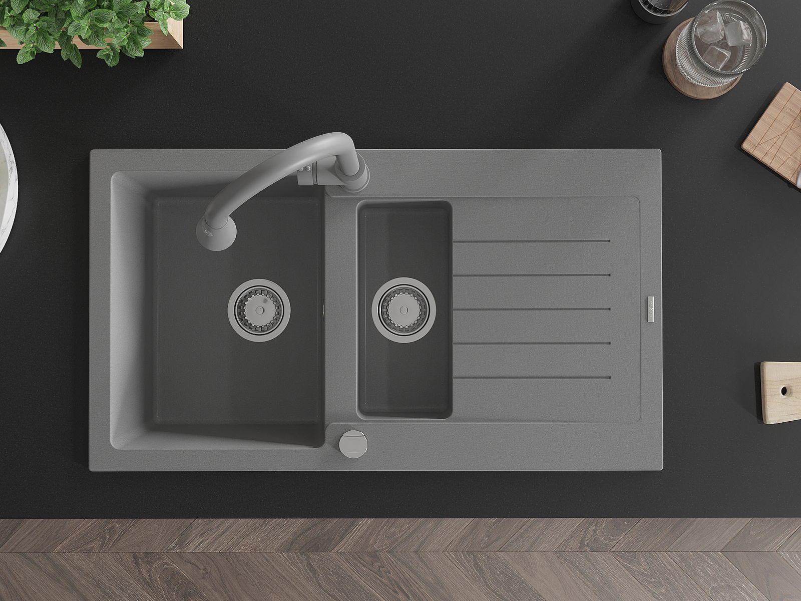 A mosogató magas minőségű gránitból készült. Elegáns, de mindenekelőtt praktikus kiegészítője minden konyhának, függetlenül annak stílusától. A gránit magas minősége és tartóssága hosszú távú használatot biztosít.