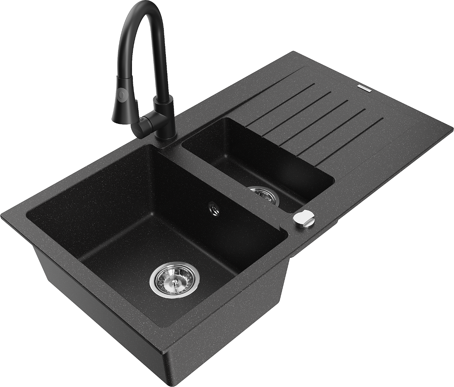 Mexen Matias gránit mosogató 1,5-medencés csepegtetővel és Elia konyhai csappal, fekete/ezüst metál - 6502-73-670101-70