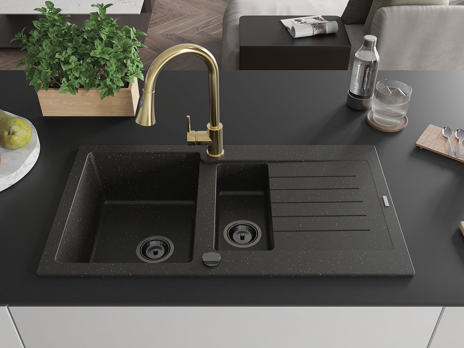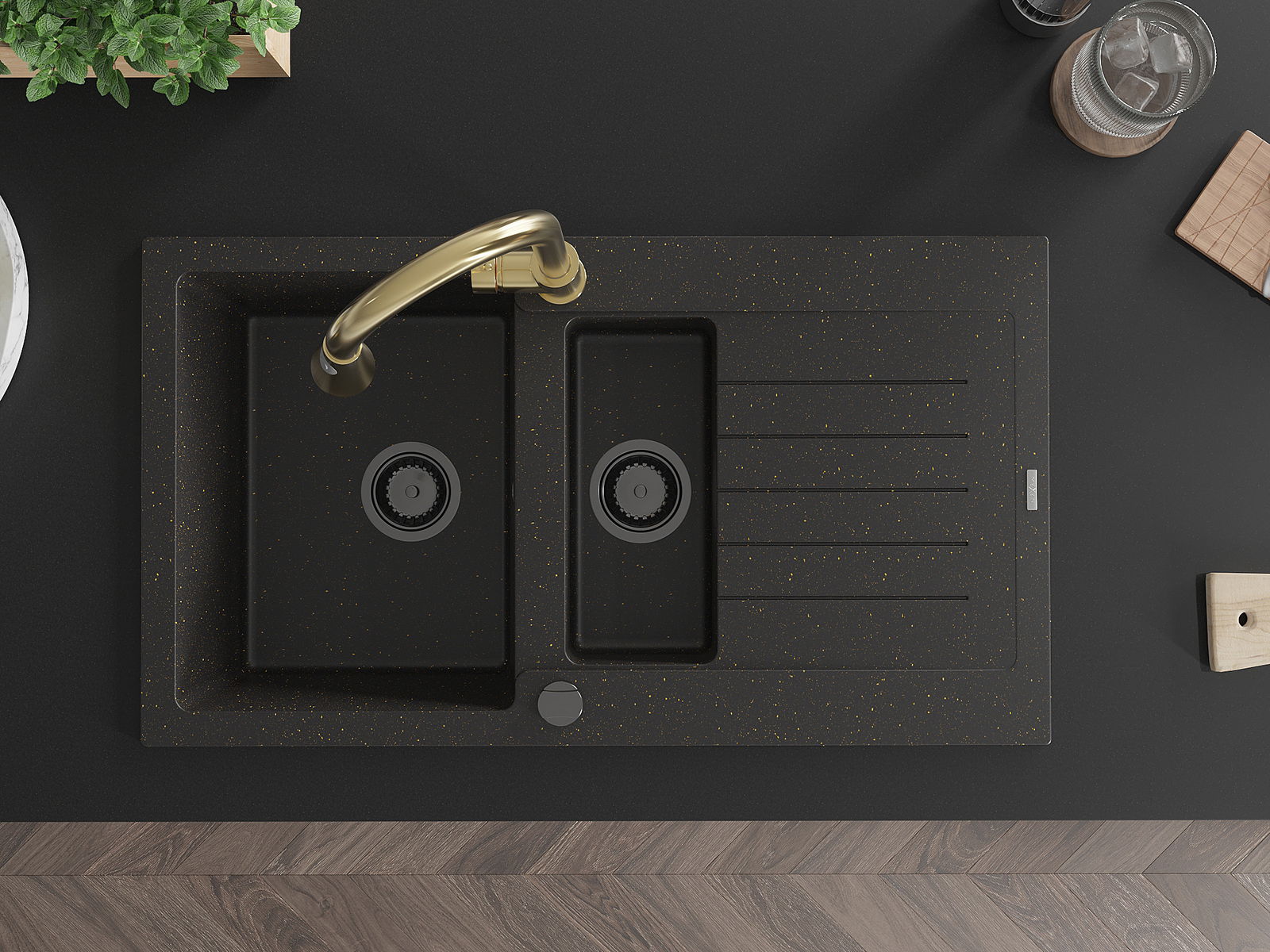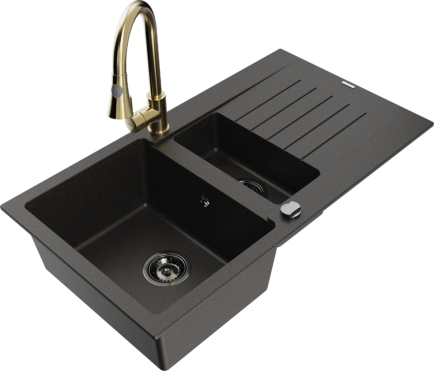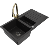 Mexen Matias gránit 1,5-medencés mosogató csepegtetővel és Elia konyhai csapteleppel, fekete/arany metál - 6502-75-670101-50-B