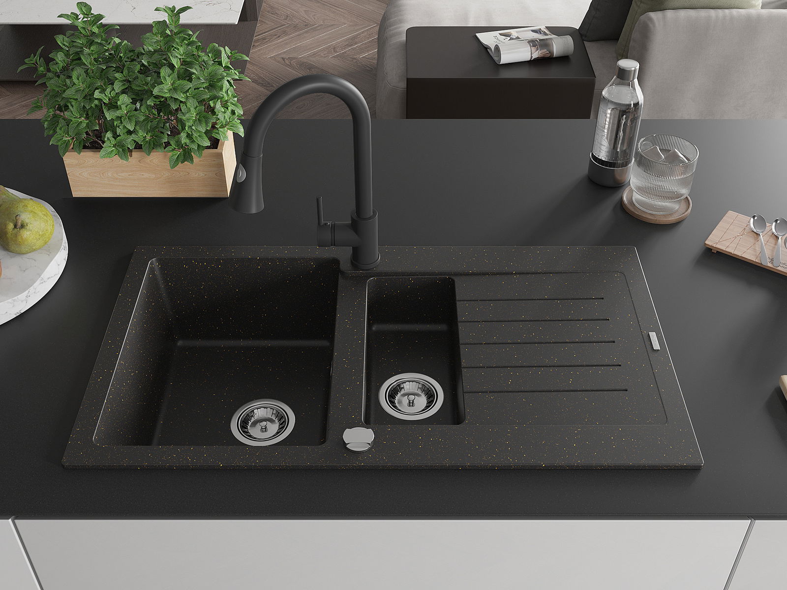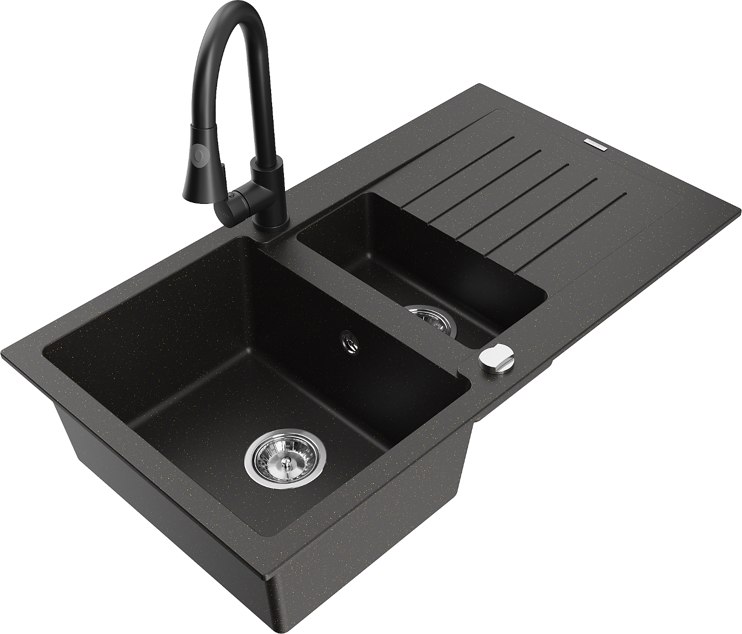 Mexen Matias gránit mosogató 1,5 medencés csepptálcával és Elia konyhai csapteleppel, fekete/arany metál - 6502-75-670101-70